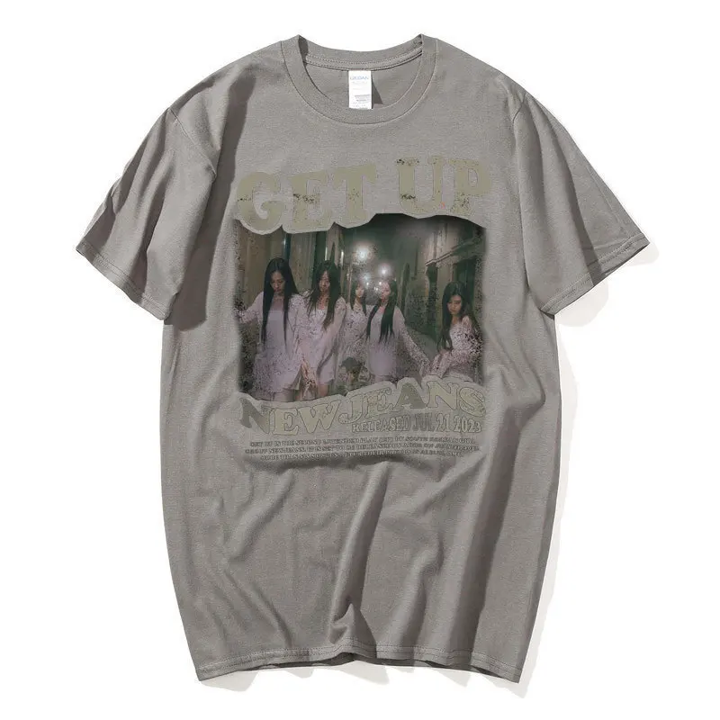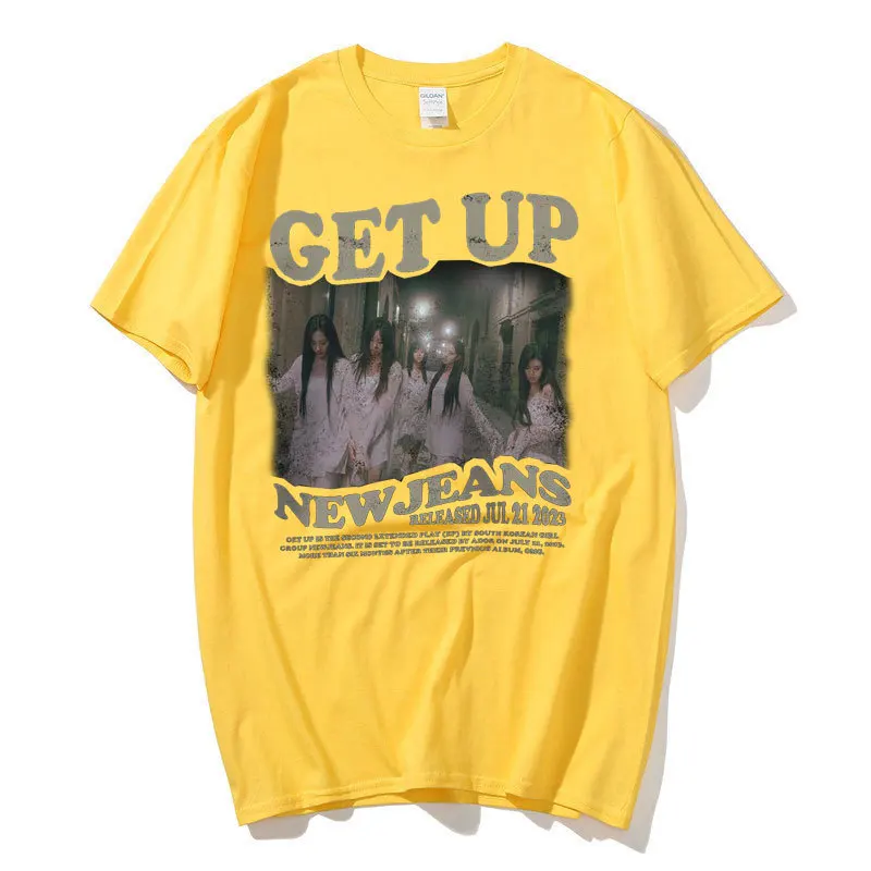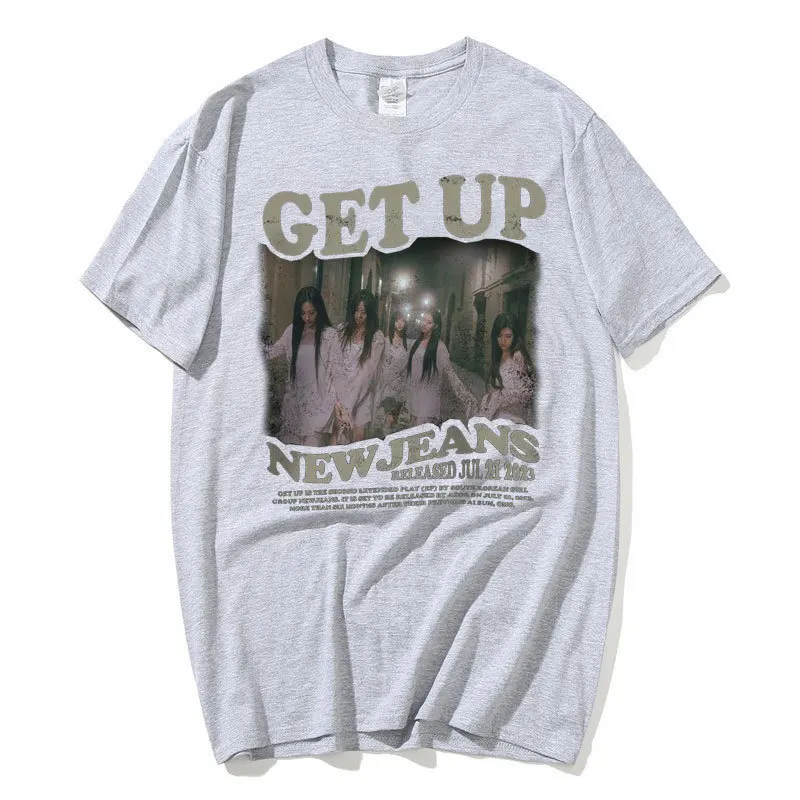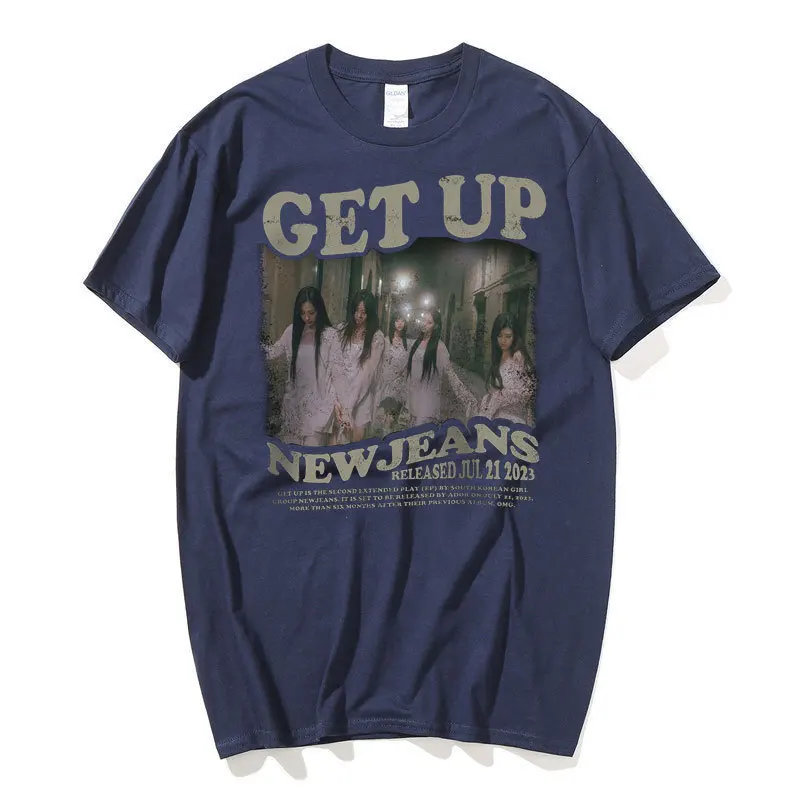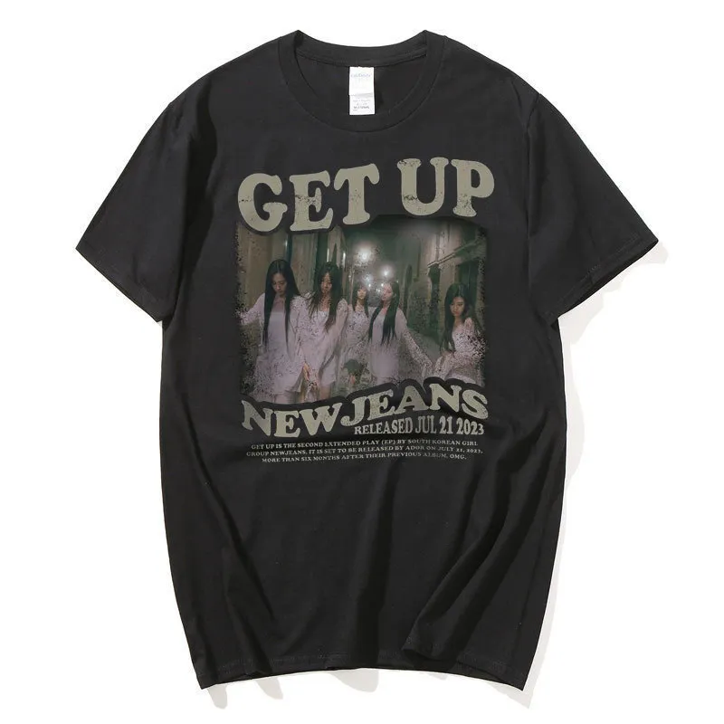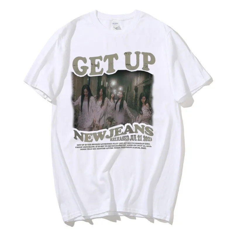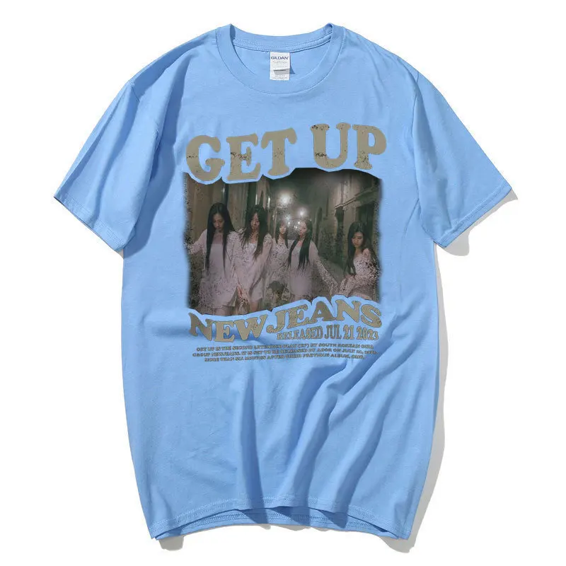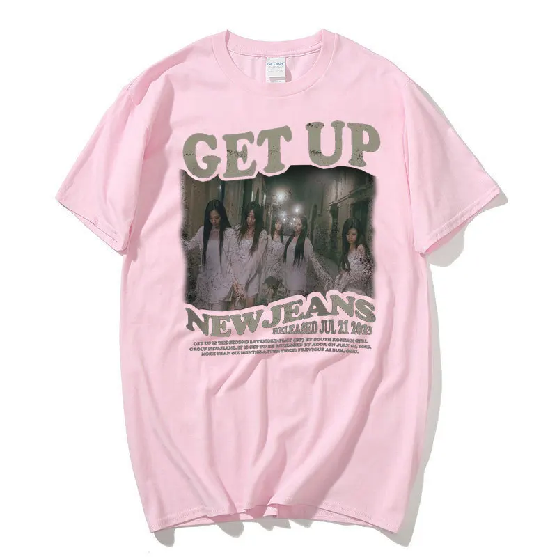 - Couleurs : Fond uni avec imprimé NewJeans Get Up