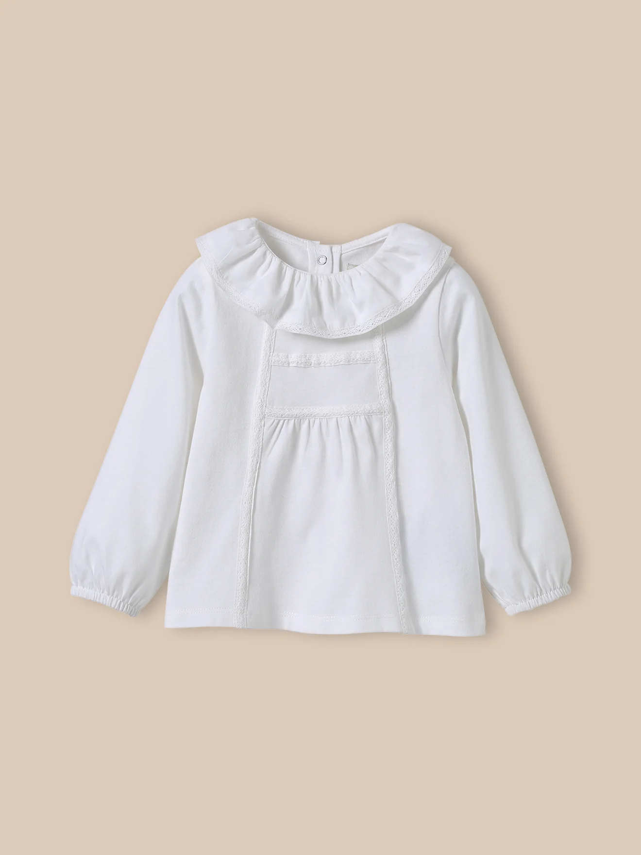 Aussi pratique qu’un tee-shirt, mais raffiné comme une guimpe, ce T-shirt trouve naturellement sa place dans les vestiaires chics. Col volanté avec dentelle Insertion de dentelle Ouverture dos par pressions. Poignets élastiqués