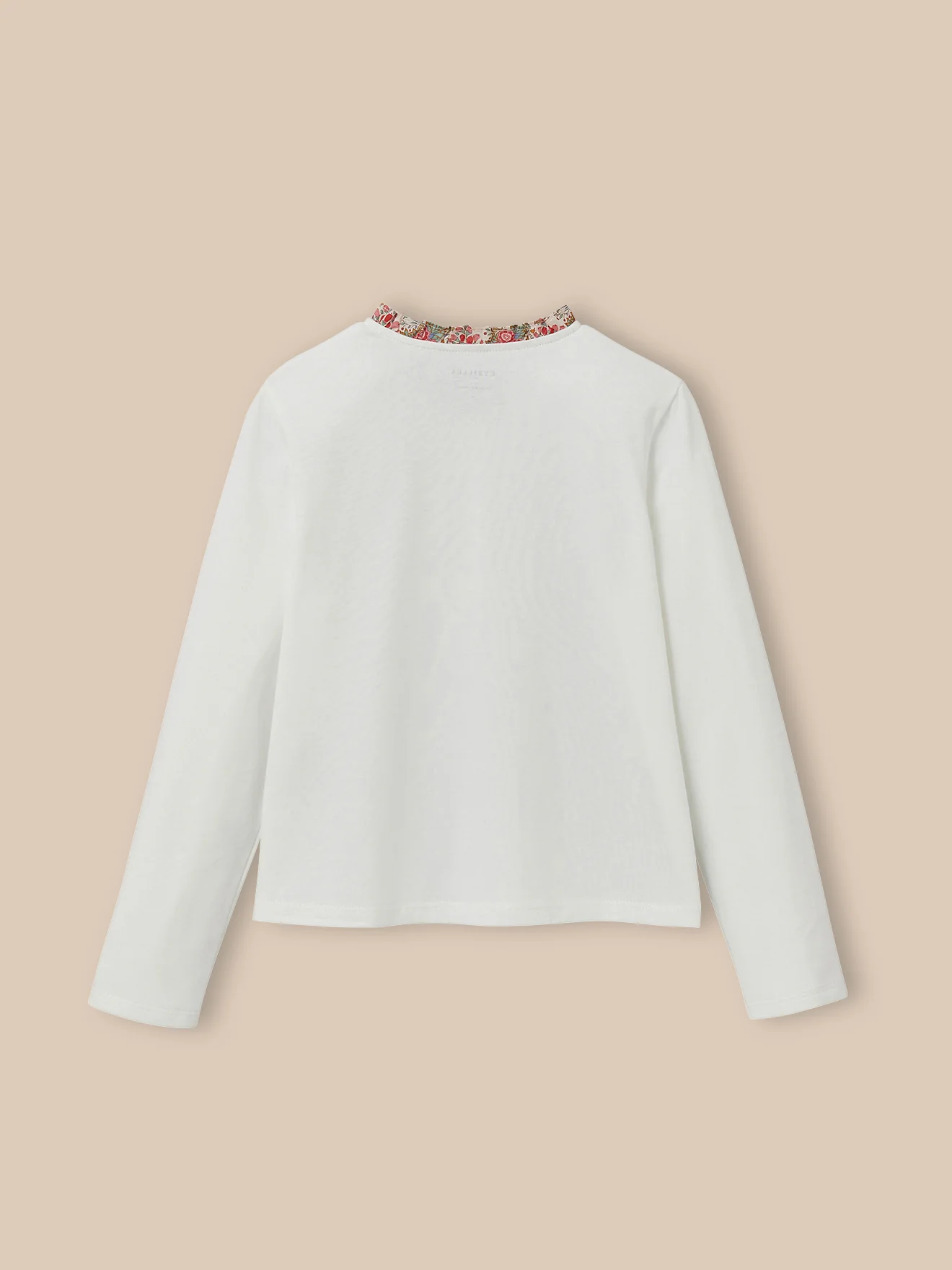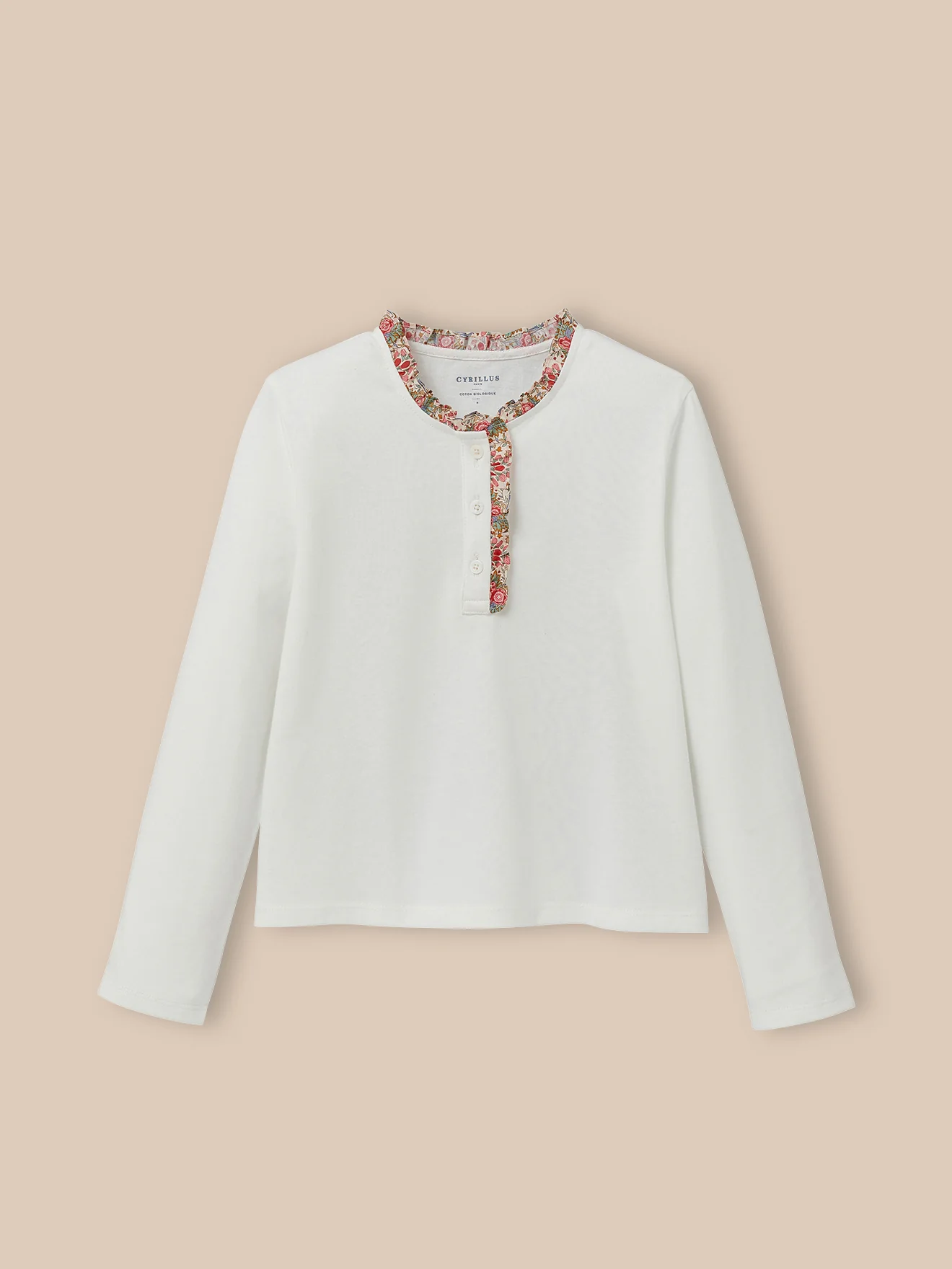 - Encolure et patte de boutonnage bordées d’un fin volant en tissu Liberty