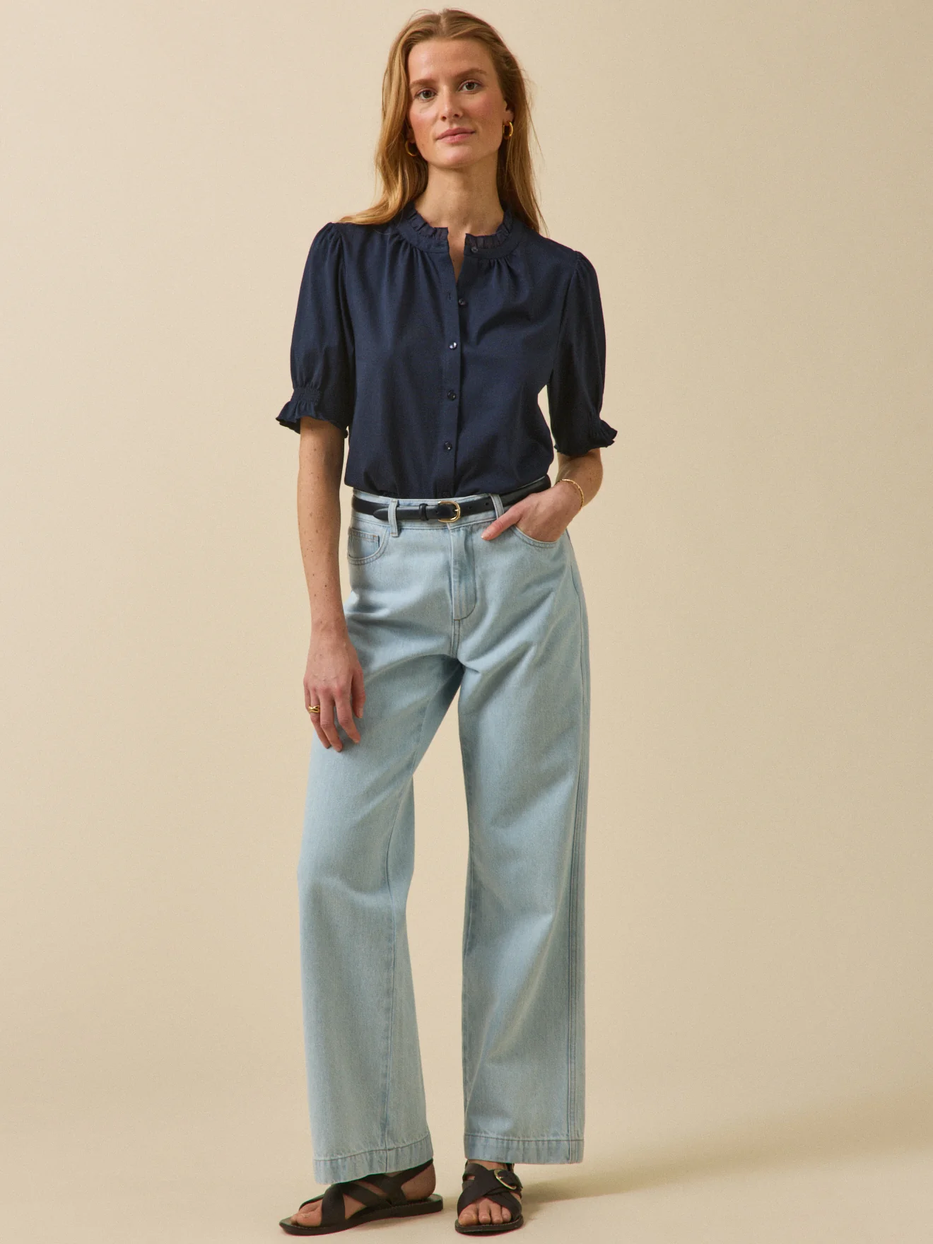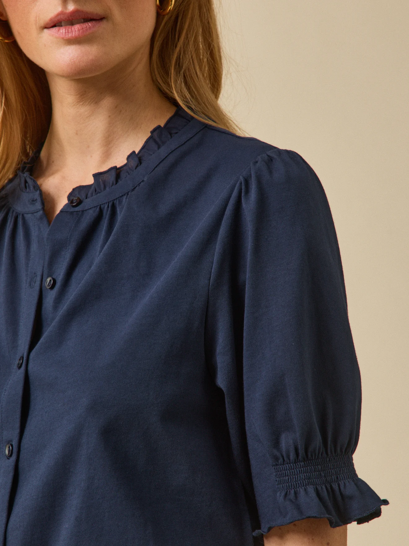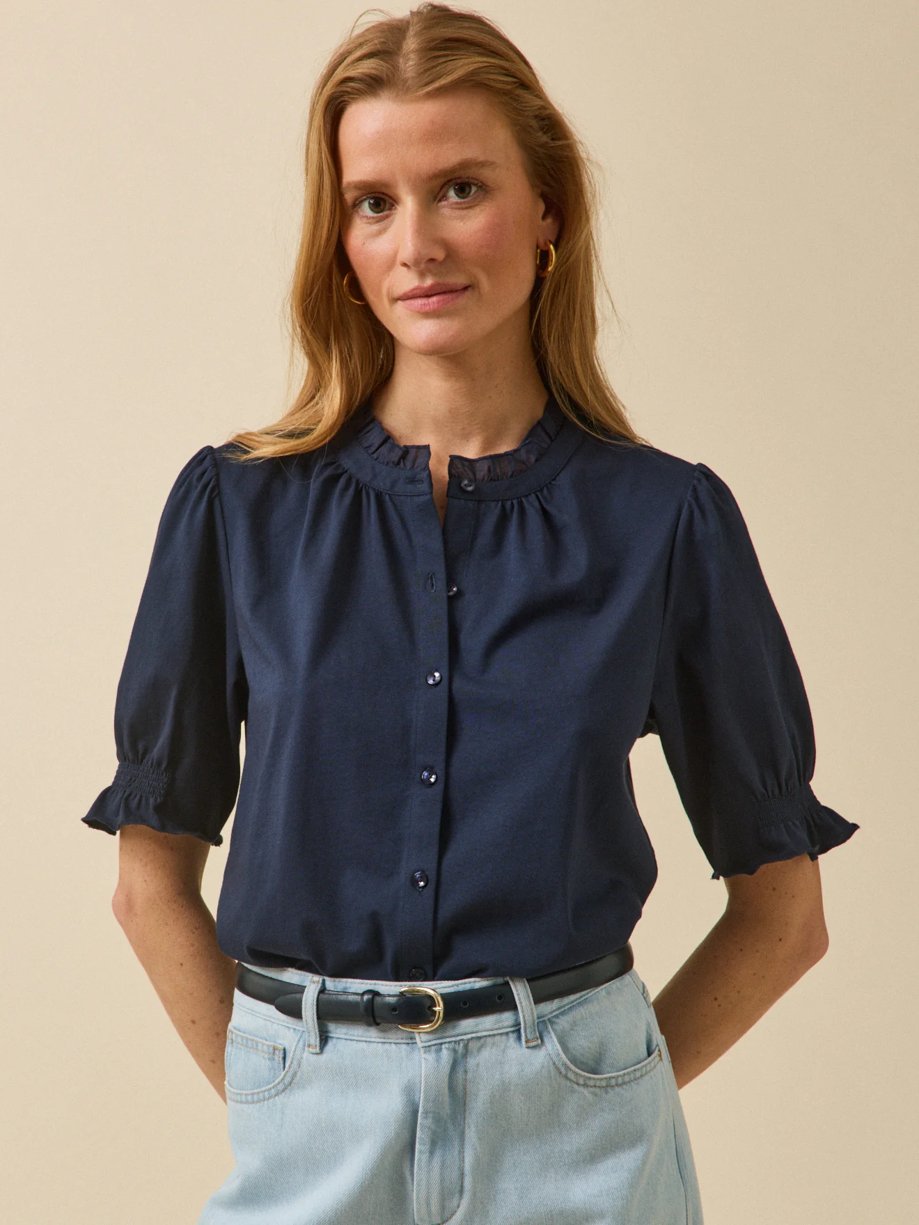 Sur un jersey qualitatif en coton biologique certifié, le T-shirt joue l’effet blouse avec son volume légèrement évasé, sa dégaine boutonnée et ses finitions volantées. Une pièce toute simple, mais très féminine, pour un quotidien chic et facile.