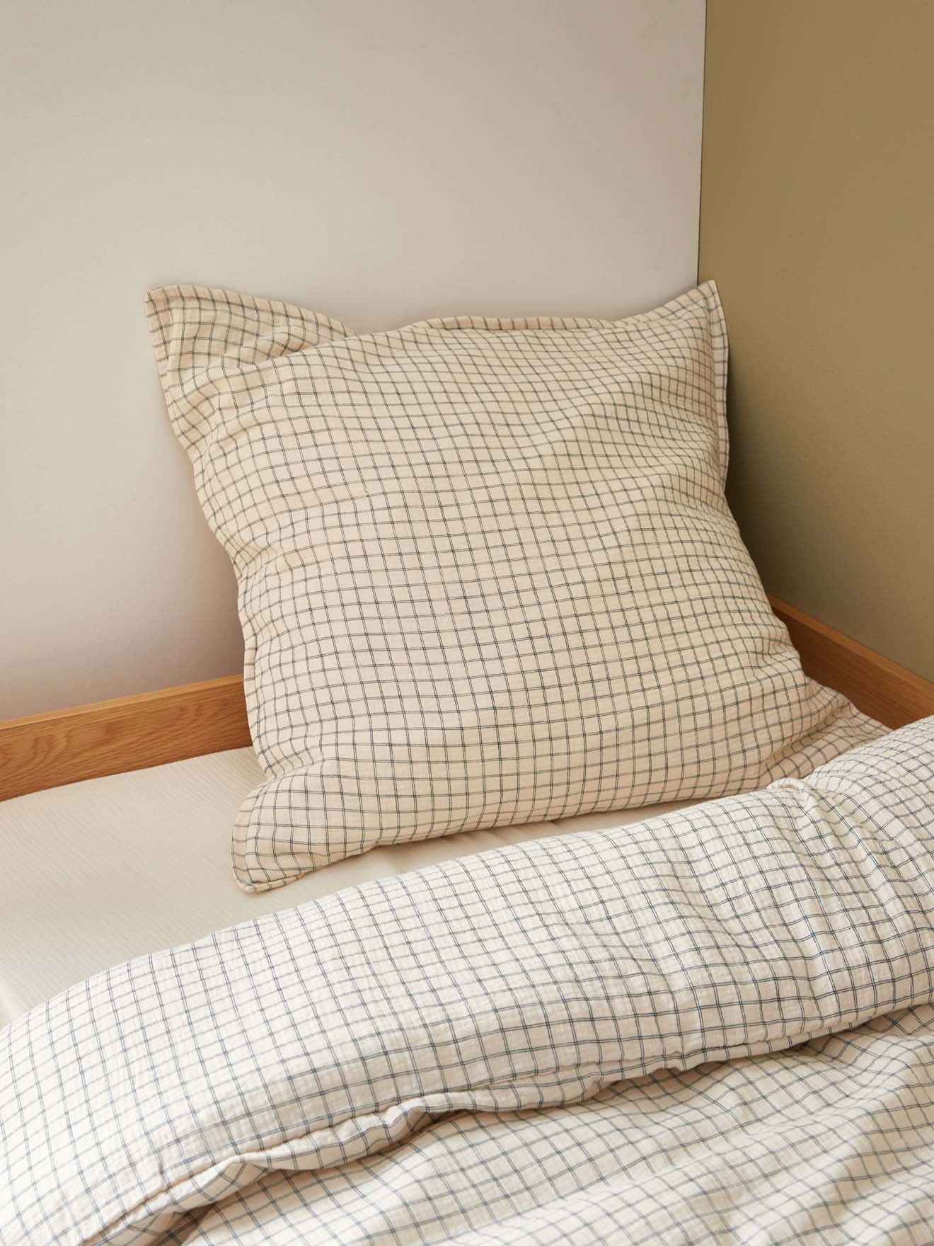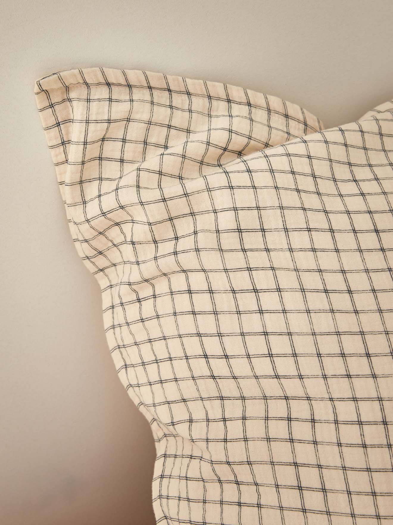 Taie d’oreiller en gaze de coton douce, légère et confortable. Ses fines lignes forment un quadrillage raffiné pour un rendu intemporel.