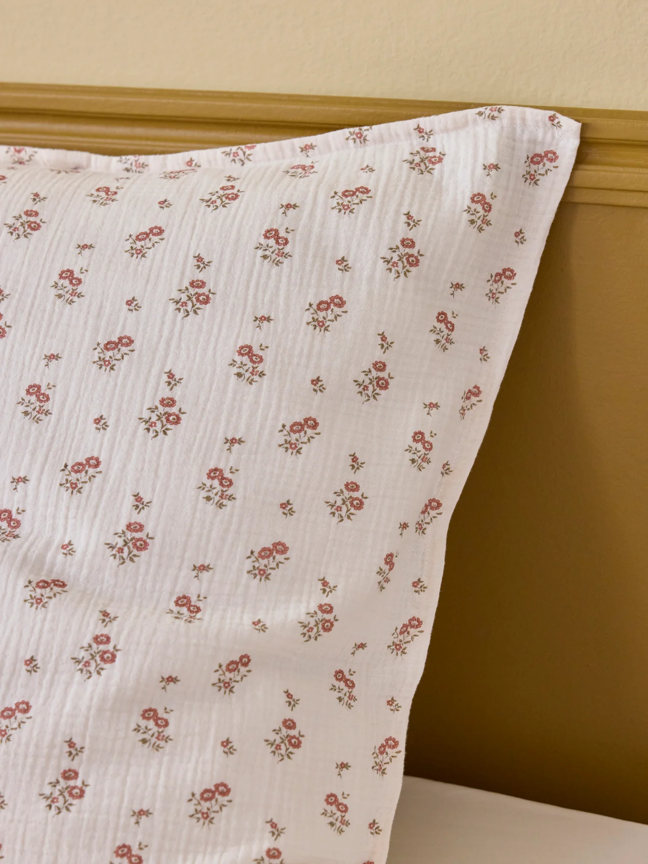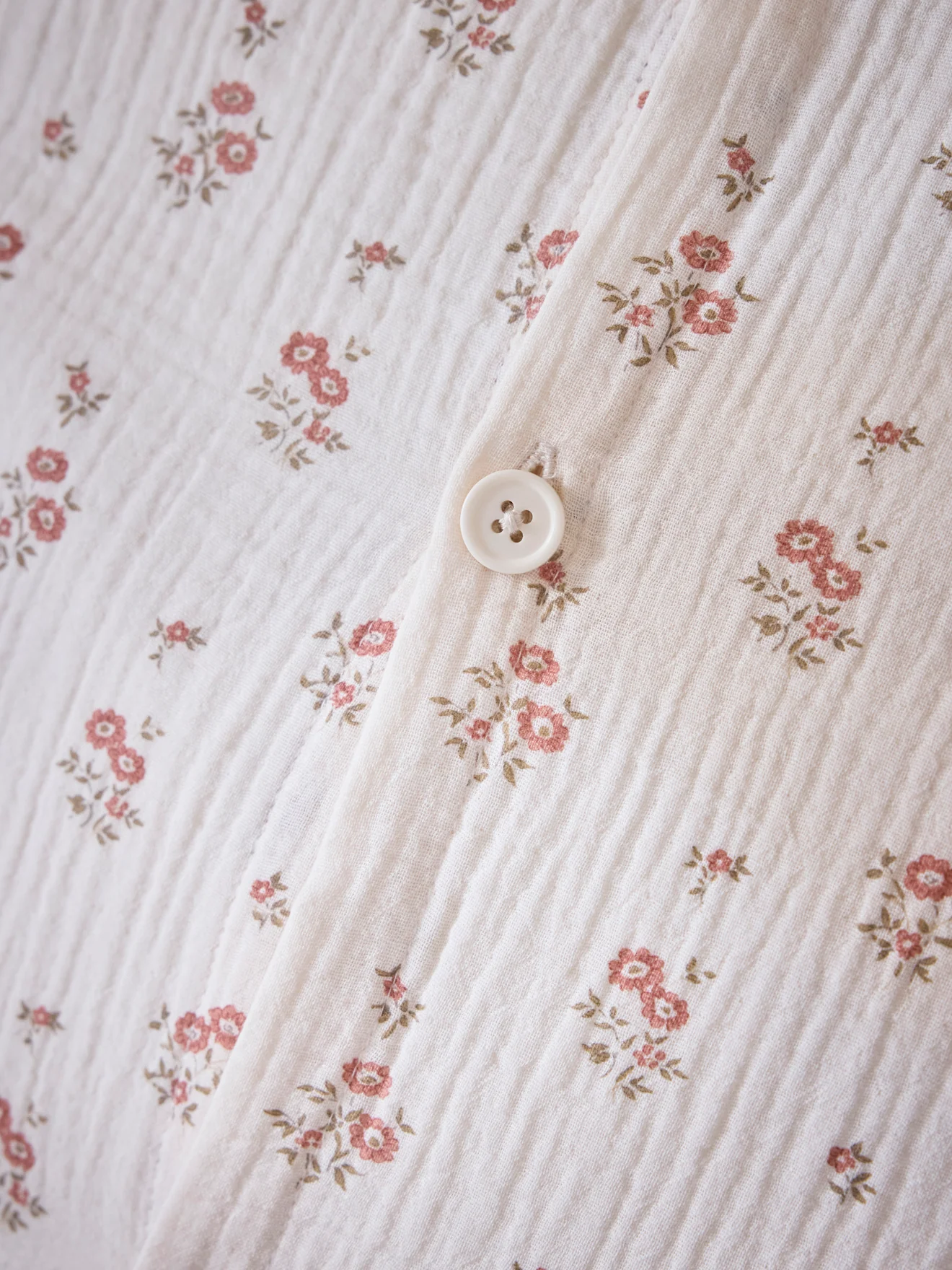 Petits bouquets de fleurs imprimés sur une gaze légèrement rosée, douce et aérienne. Taie d’oreiller imprimée recto/ verso, bordée d’un petit volant plat et fermée au dos par des boutons.