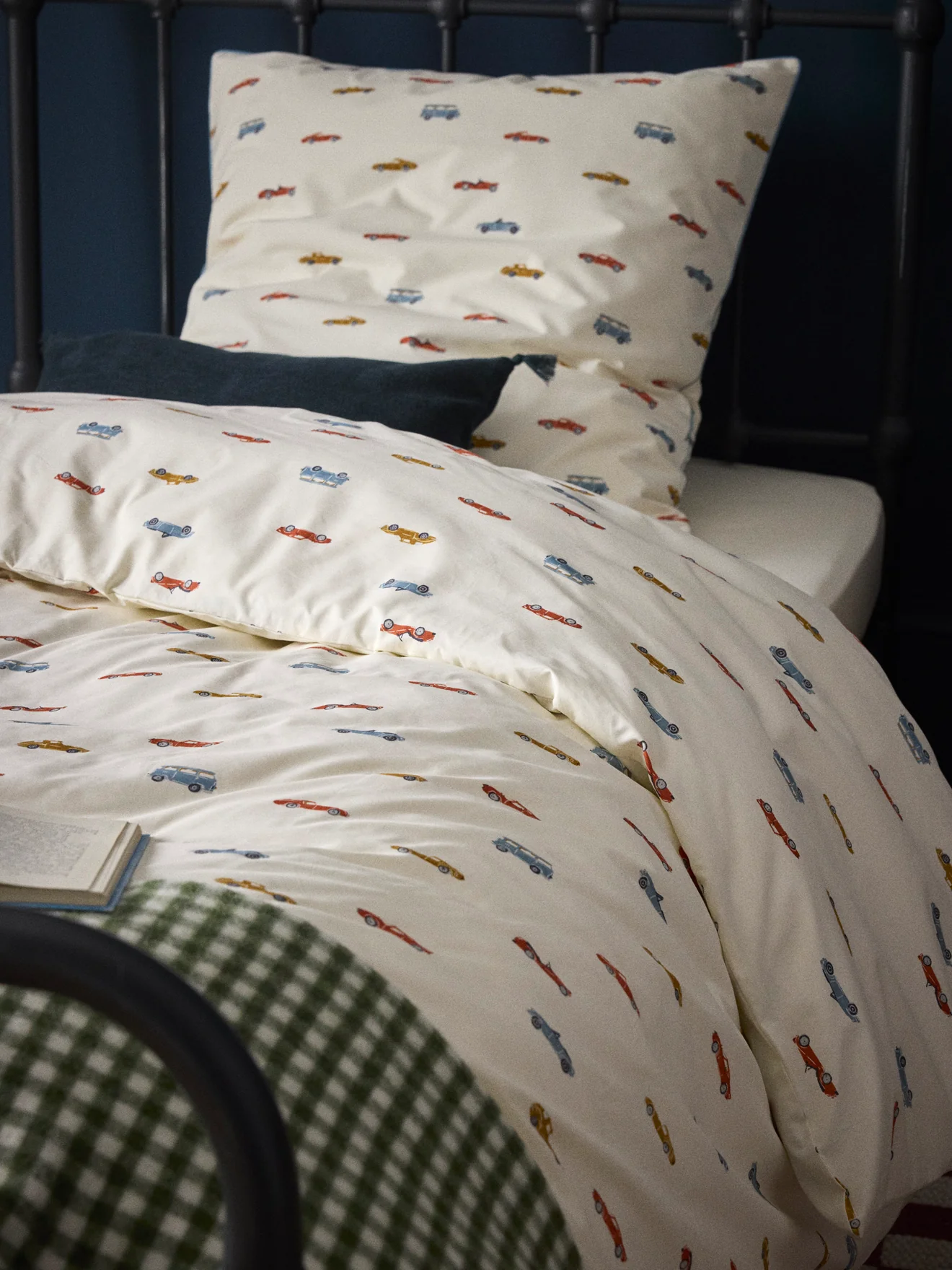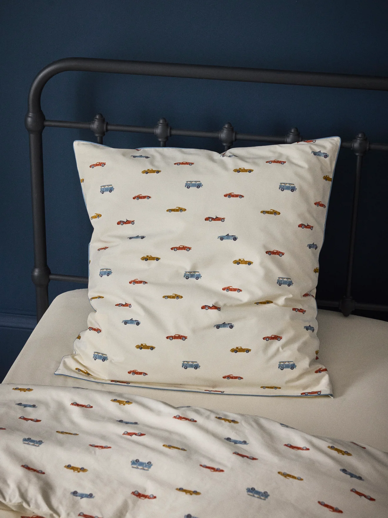 Taie d’oreiller en percale de coton douce et résistante imprimée recto/verso avec rabat intérieur et petit volant plat. Les voitures anciennes sont des illustrations réalisées par notre équipe de style en exclusivité pour Cyrillus.