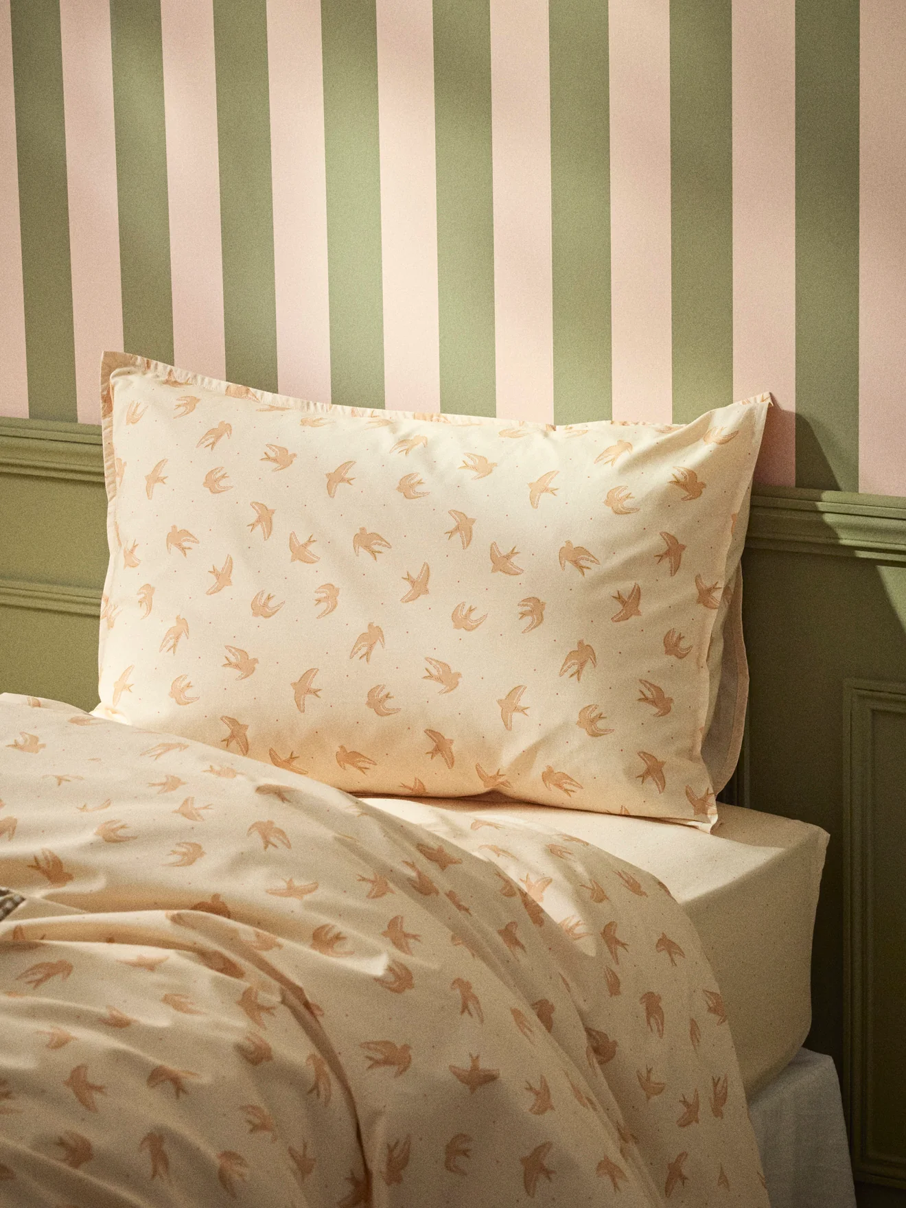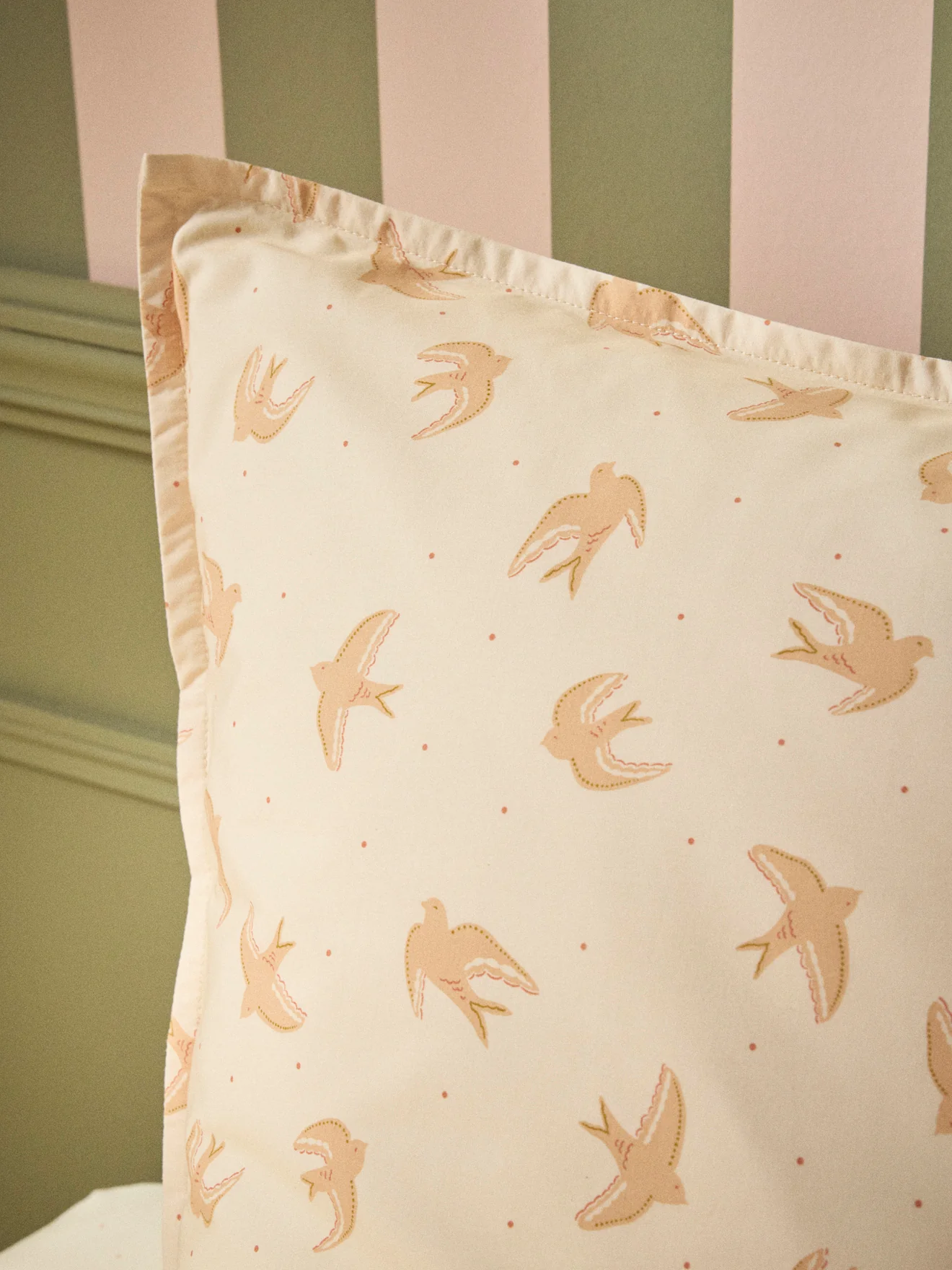 Envolée de colombes sur une belle percale de coton parsemée de petits pois coloris terracotta sur fond nude. Taie d’oreiller avec rabat intérieur et petit volant plat.