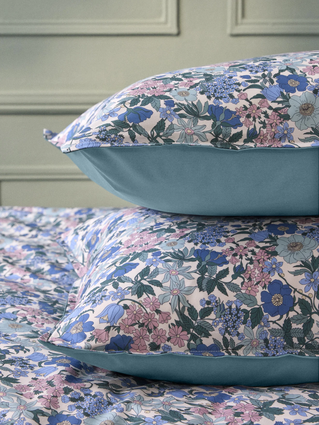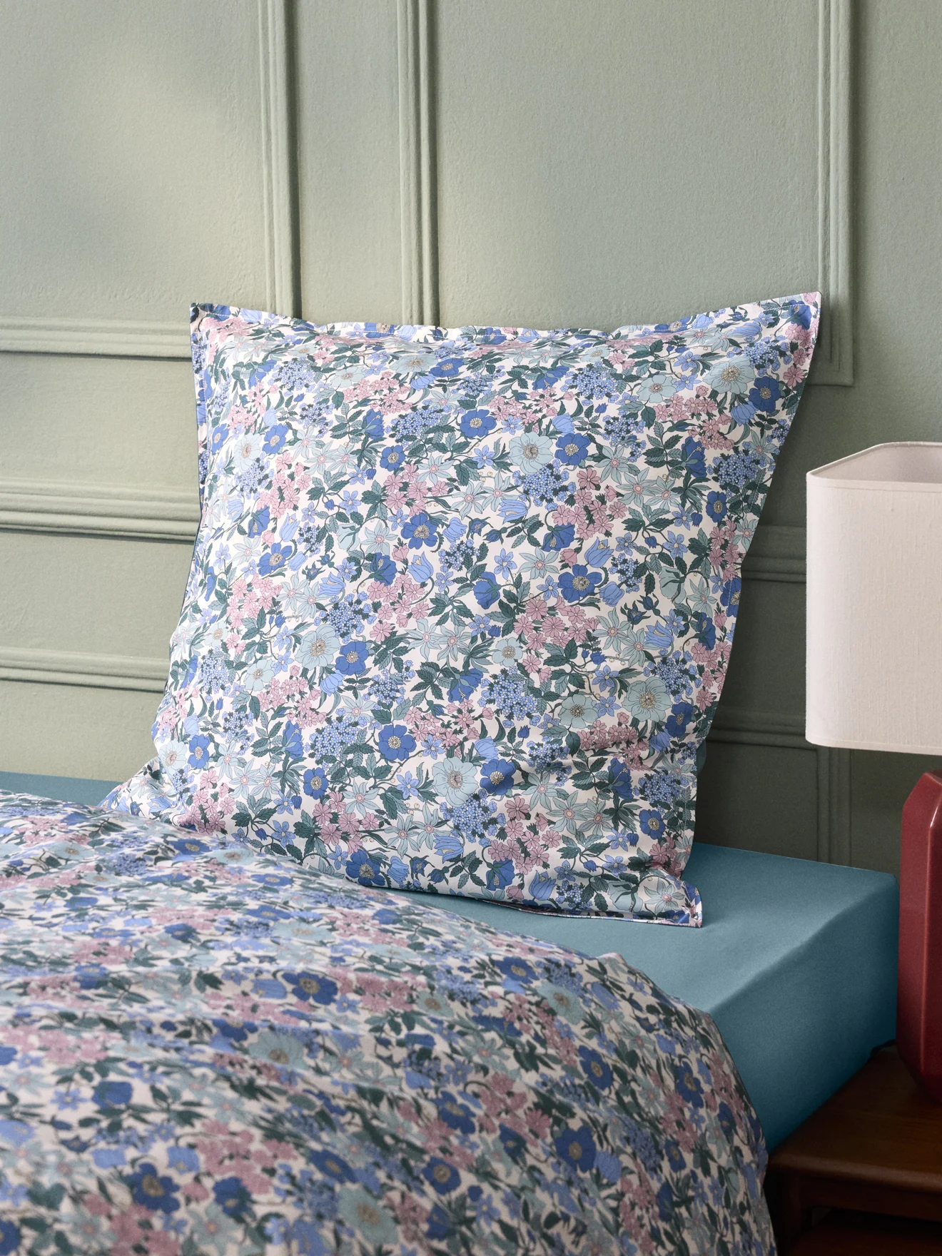 Un jardin anglais au cœur de votre chambre. Confectionnée au Portugal, la taie d’oreiller marie le raffinement du tissu Liberty Clara Bell sur 1 face, à l’intensité d’une percale vert bleuté sur l’autre.