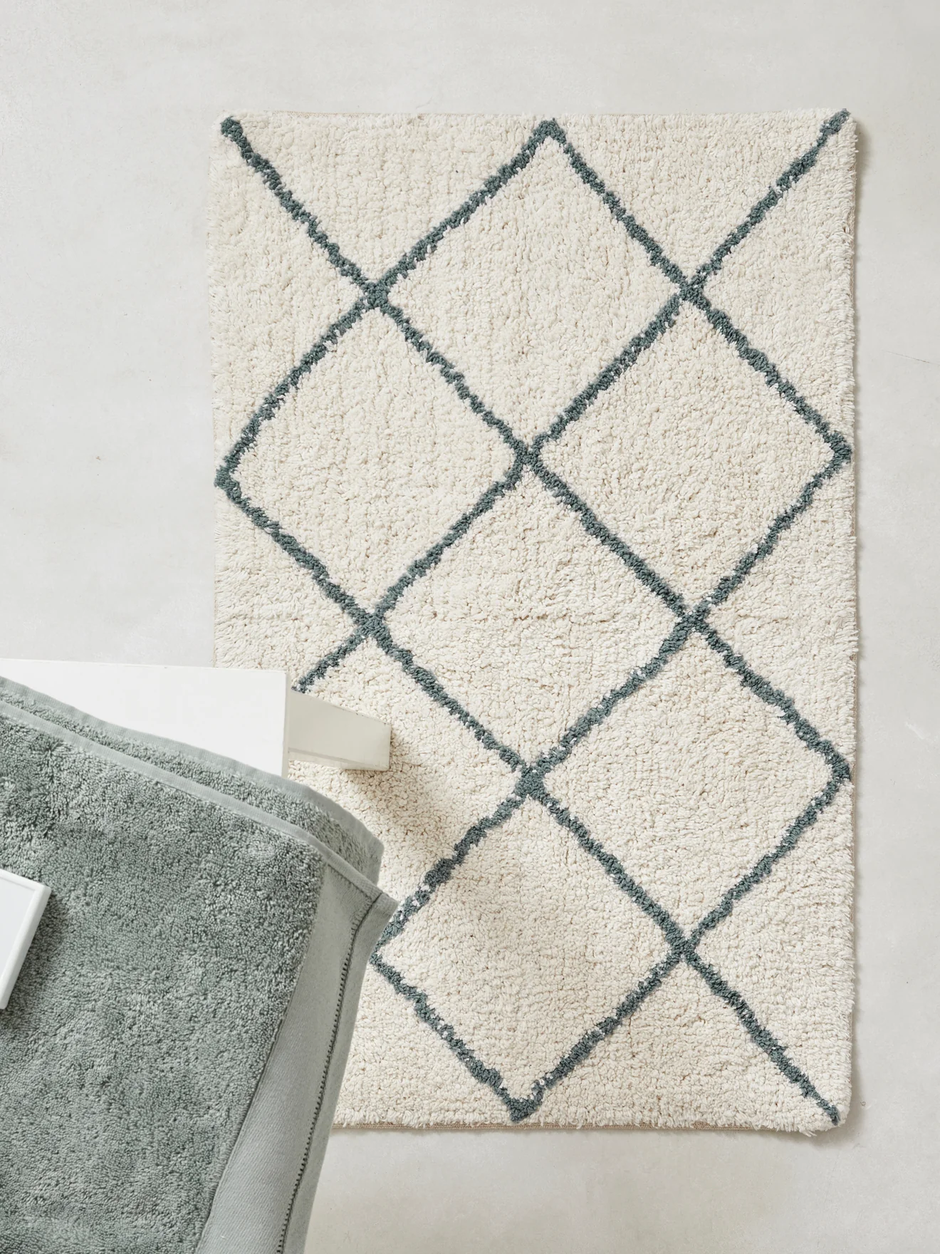Tapis de bain en coton absorbant. Recouvert de croisillons, il s’imprègne du style berbère très en vogue.
