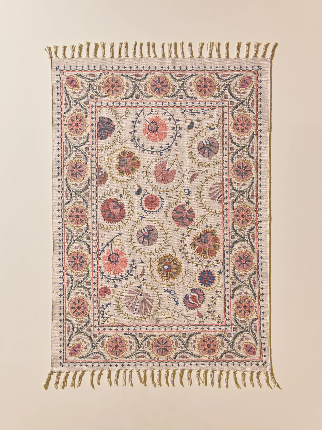 Petit tapis ou descente de lit en coton avec motifs imprimés et détails brodés à la main. Finition franges nouées. Un tapis originale et authentique, fabriqué en Inde de façon artisanale.