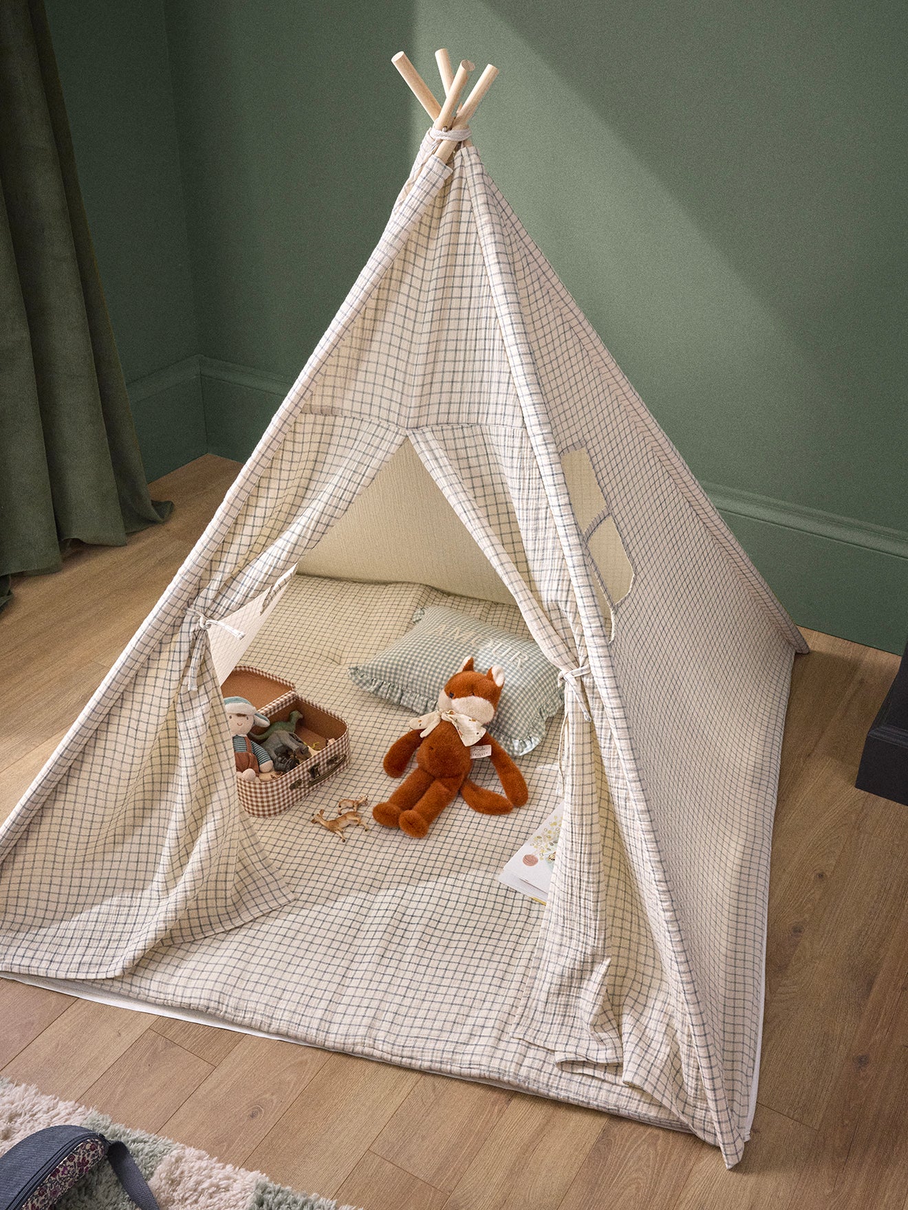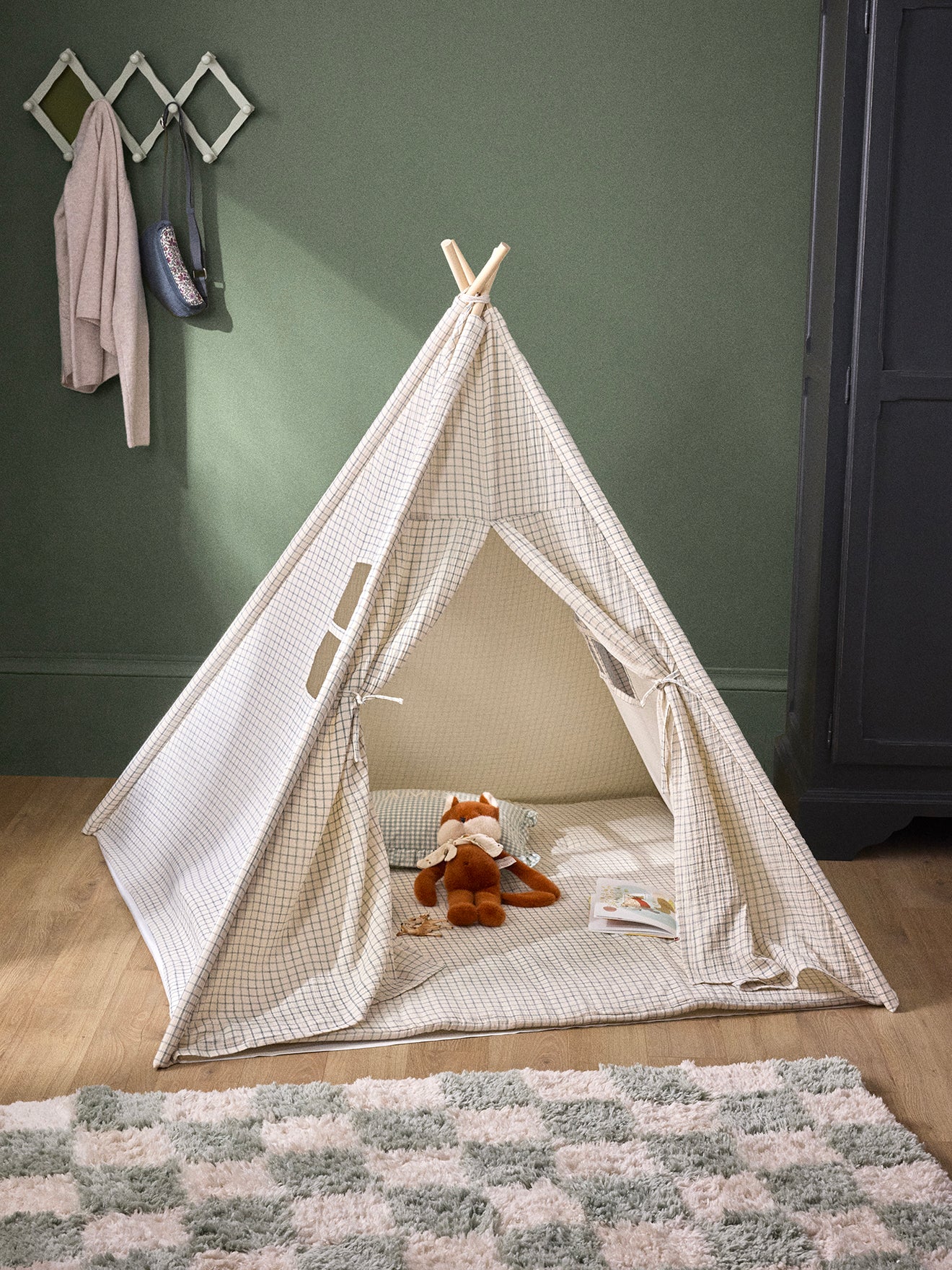 Tente d’enfant réalisée dans un esprit maisonnette, composée de 4 piquets en bois et d’une toile en gaze de coton imprimée. Petit cocon pour jouer ou se détendre confortablement grâce au matelas moelleux inclus.