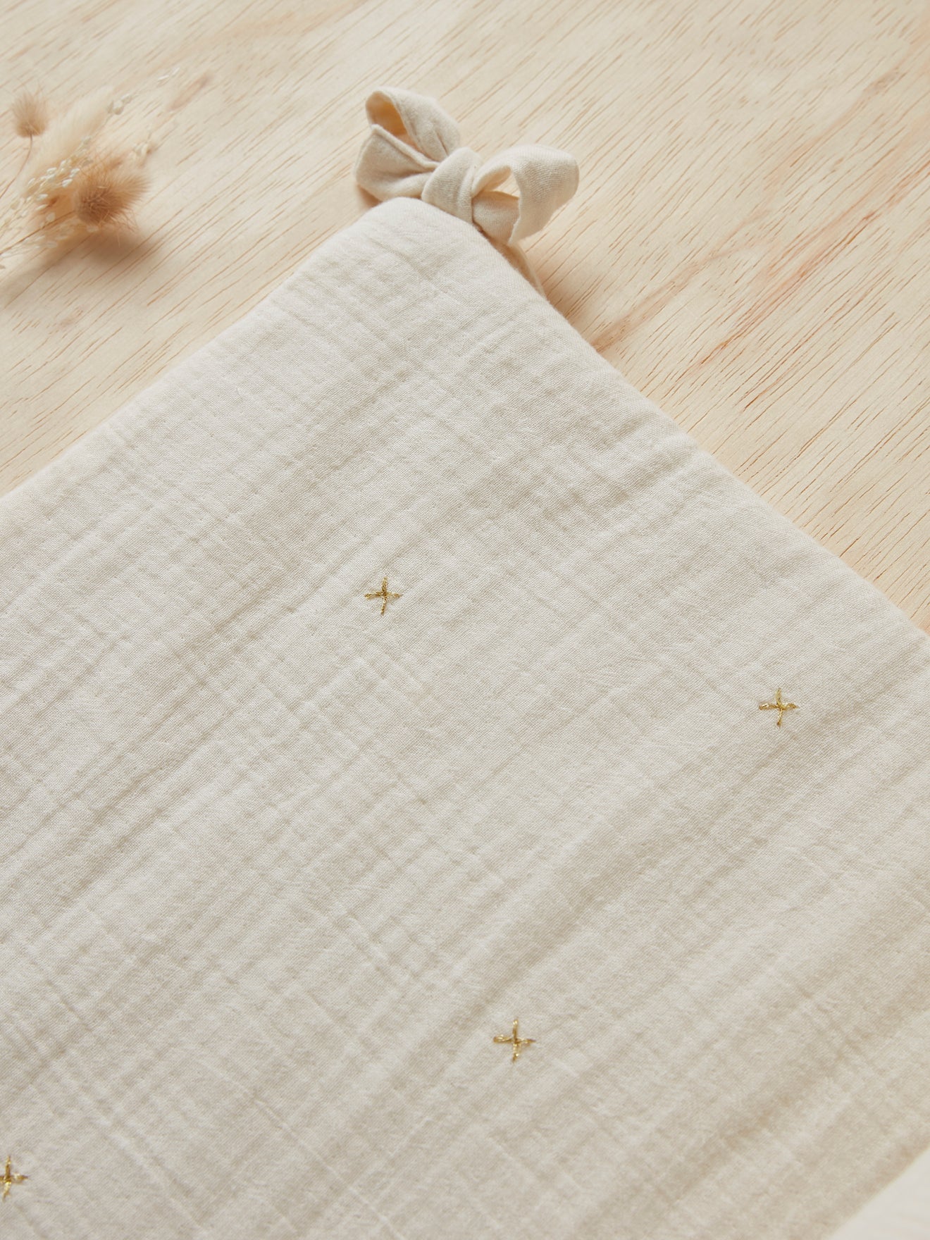 Tour de lit en gaze de coton biologique à l’aspect froissé, souple et aérien. Habillage élégant et actuel pour lit à barreaux.