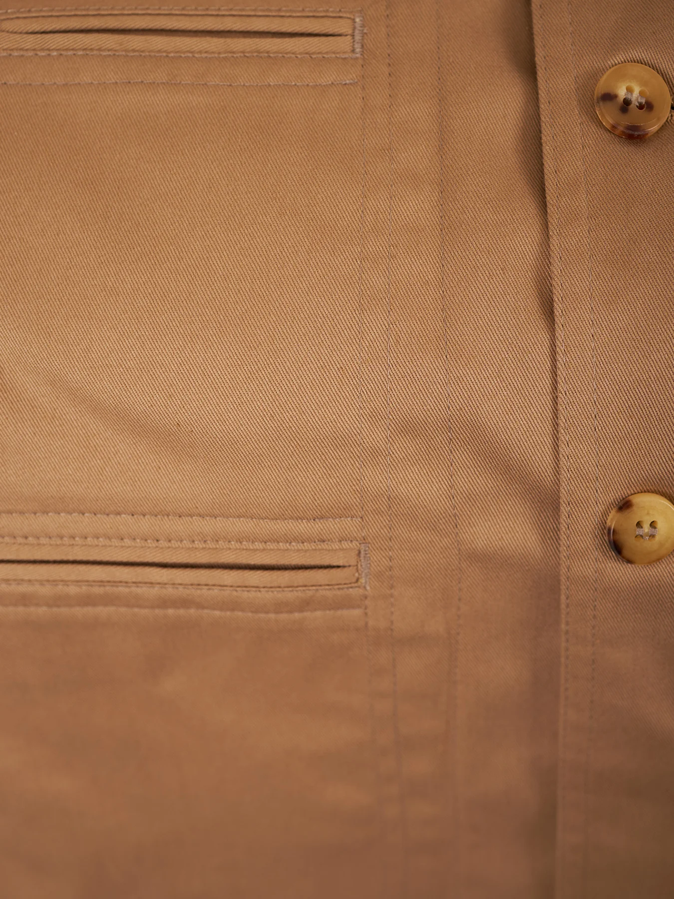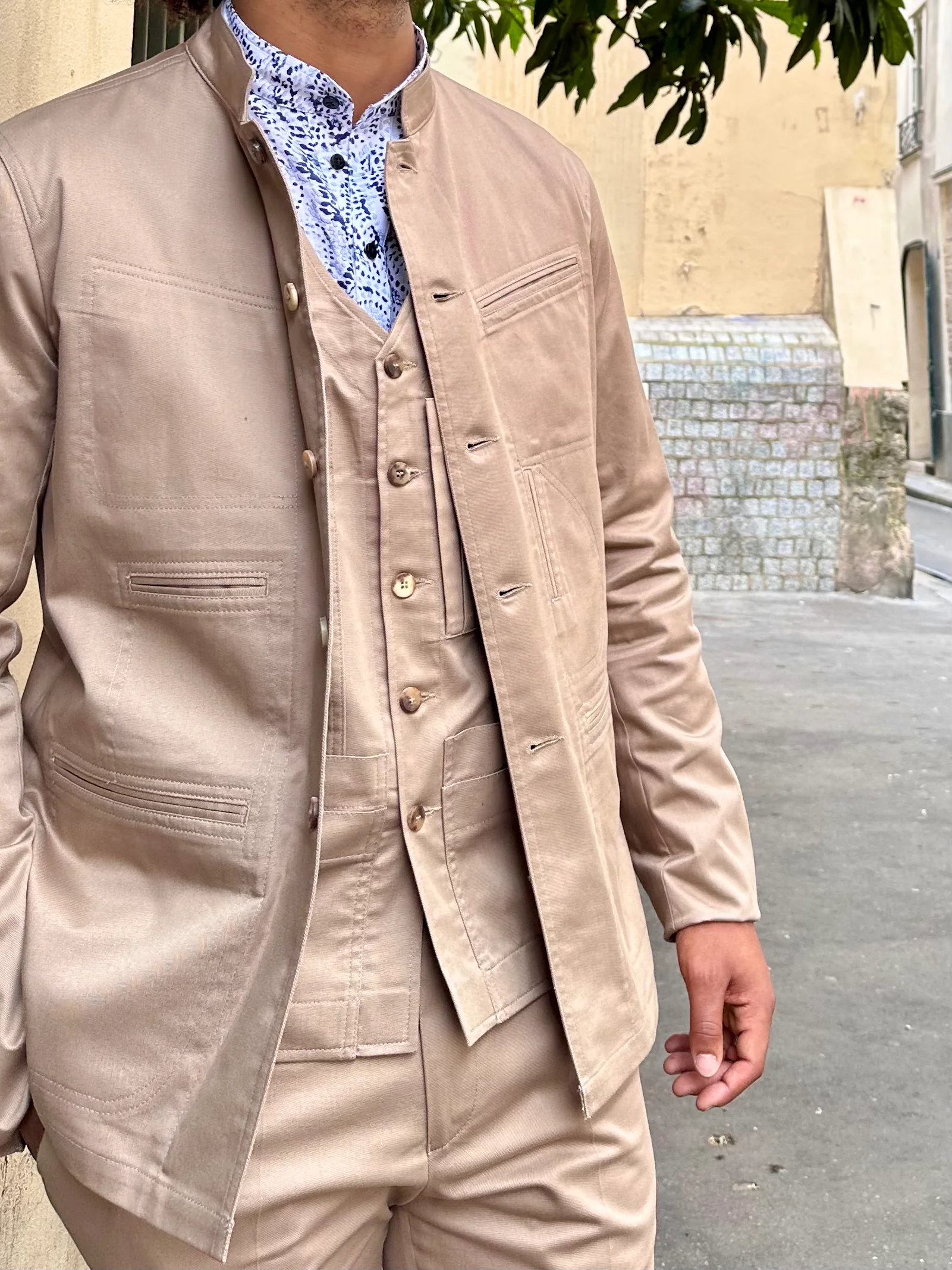 veste architecte en serge de coton extensible sable __TAB__ fiche technique Veste Architecte à col Nehru Doublée dans le même tissu, non doublée au dos Coupe droite Cinq poches extérieures passepoilées et incrustées Deux poches intérieures zippées et une poche poitrine passepoilée Plis d’aisance au dos Longueur dos taille 46 : 76 cm Boutons en […]