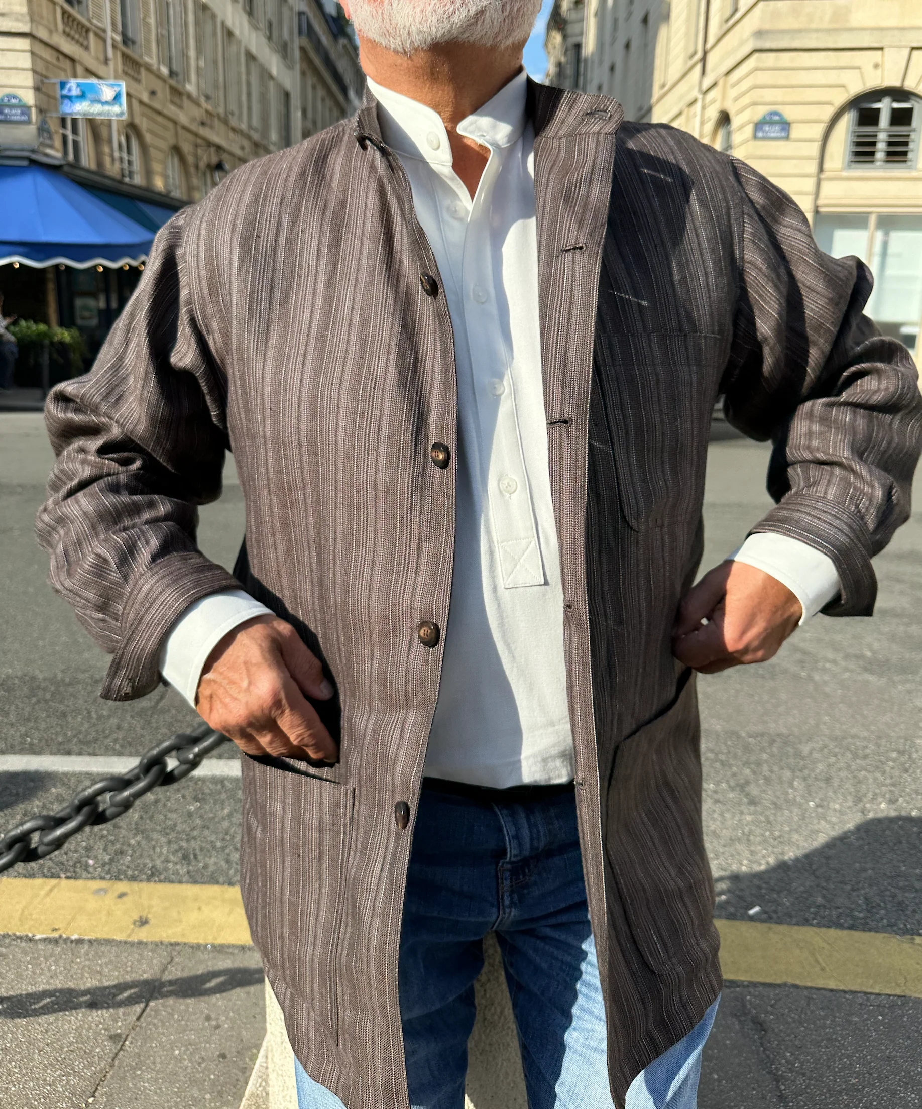 veste-chemise col mao en serge de lin écorce