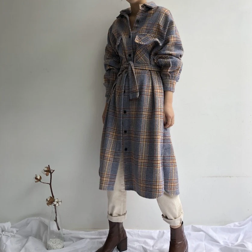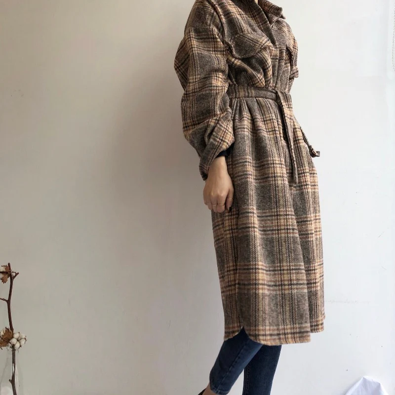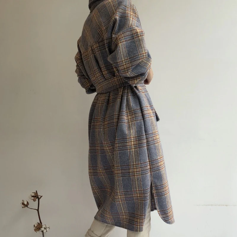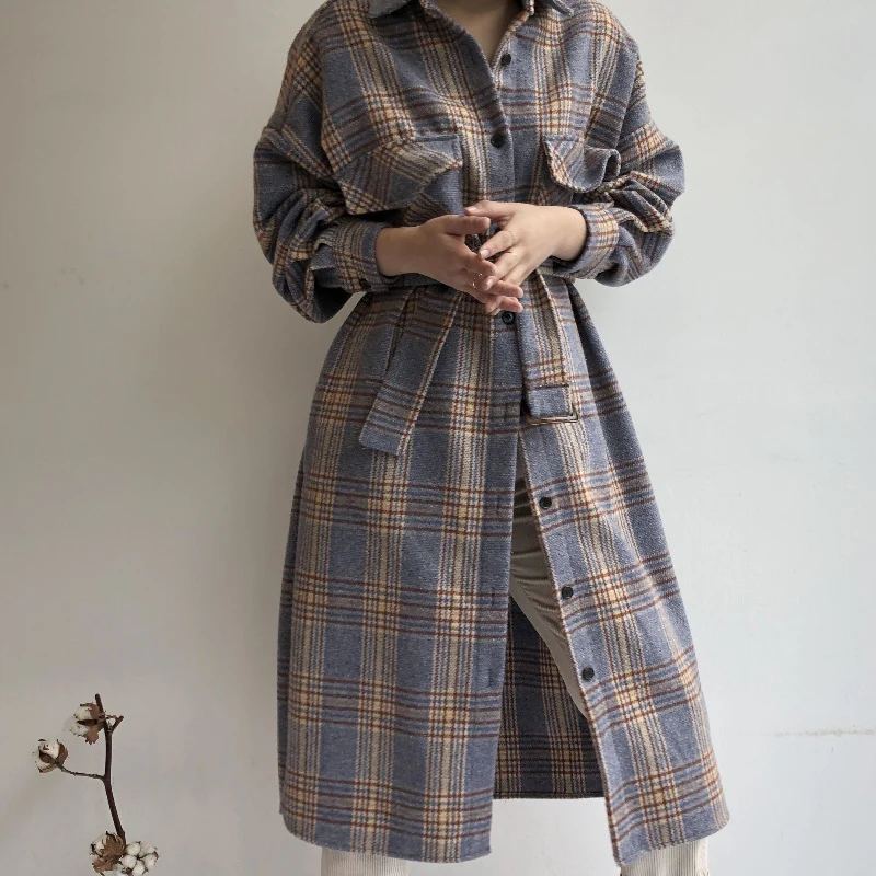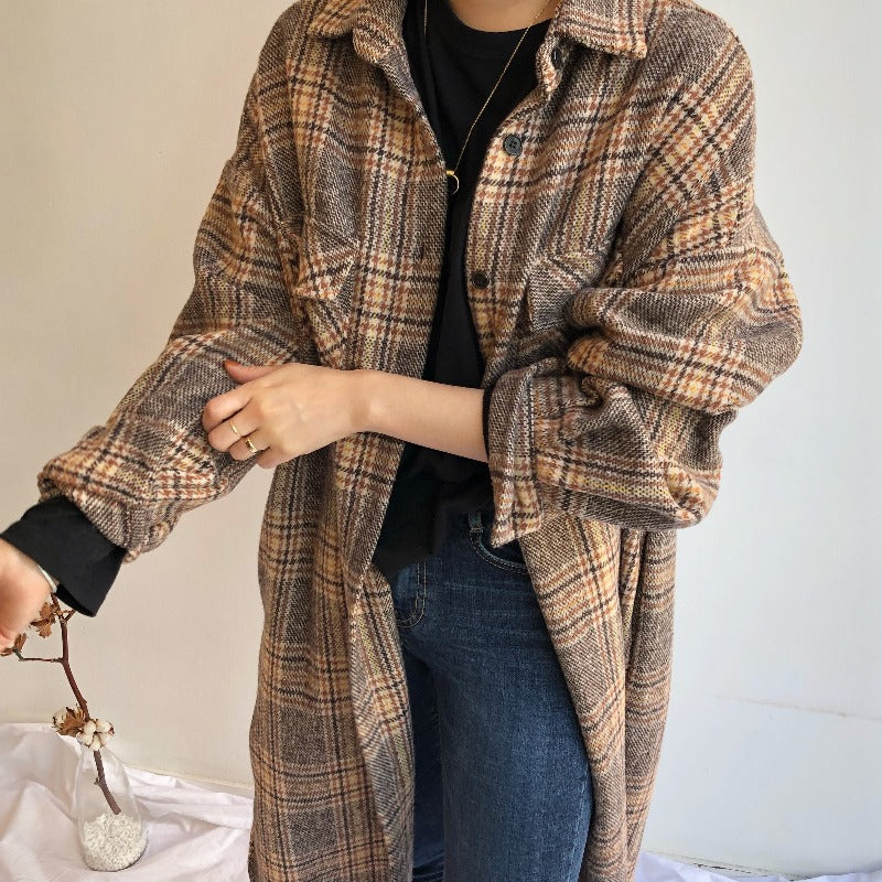 Voici notre Veste longue à carreaux issue des tendances coréennes. Elle possède un motif Vintage et un tissu qui tient chaud. La veste parfaite pour les jours frais.