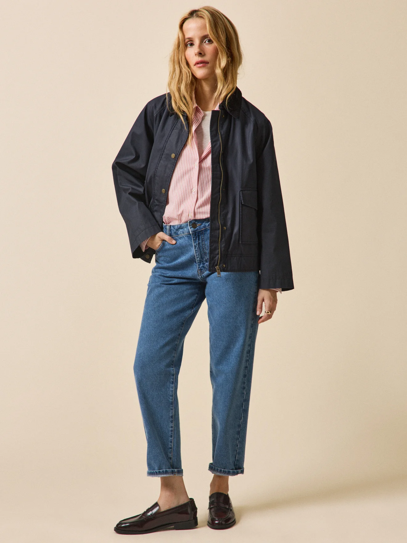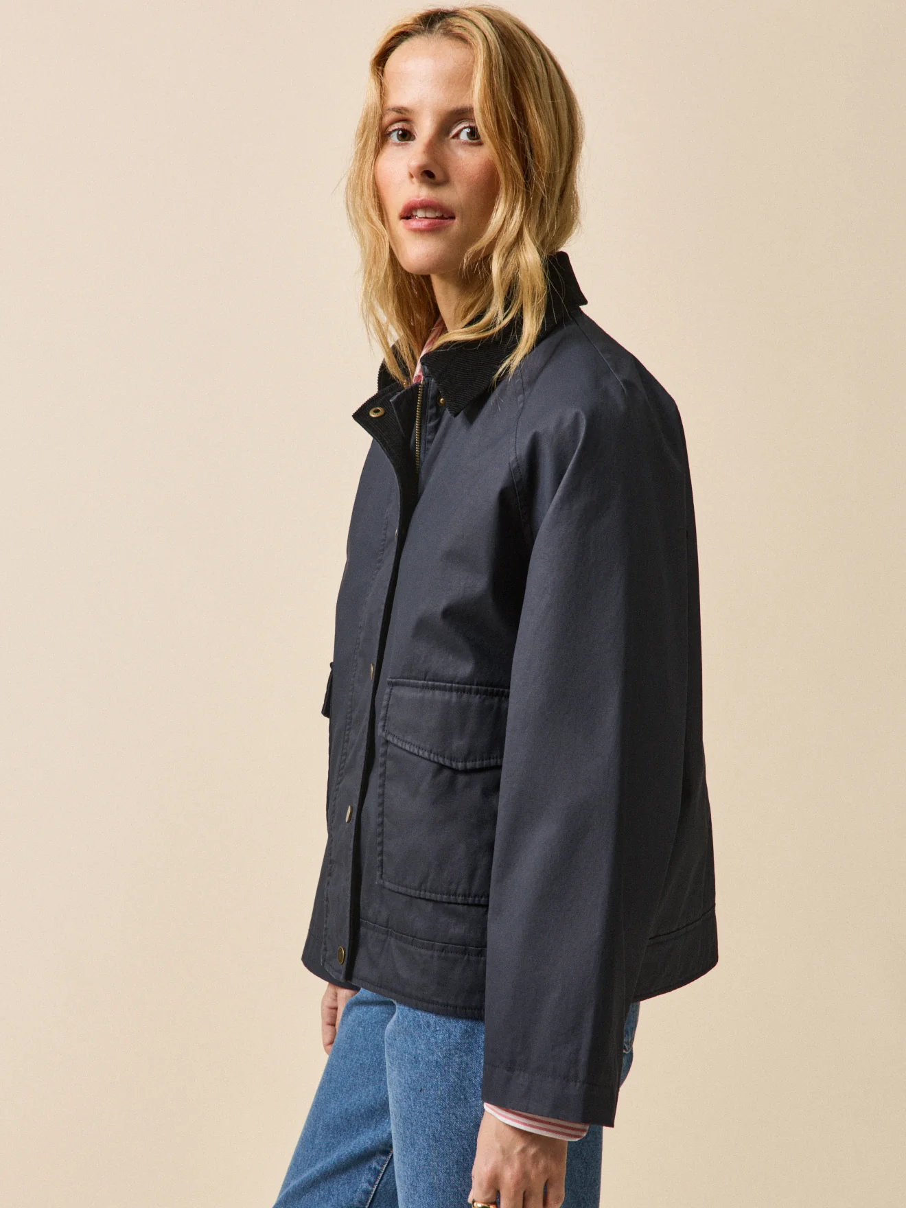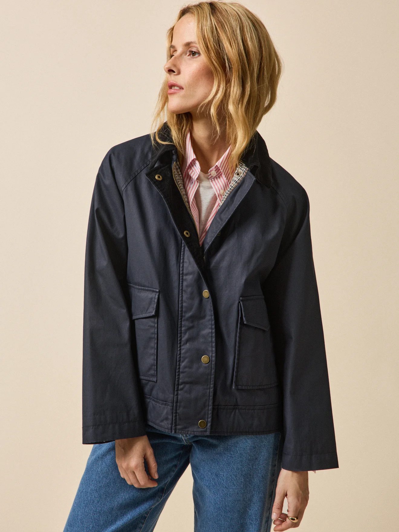 Esprit sport chic, elle se prête à un vestiaire mi-saison, qu’il soit urbain ou décontracté. Travaillée dans un coton enduit, cette pièce confortable inspirée de la veste de chasse gagne en modernité avec son col en velours côtelé contrasté, son volume raglan et sa doublure fantaisie carreaux.