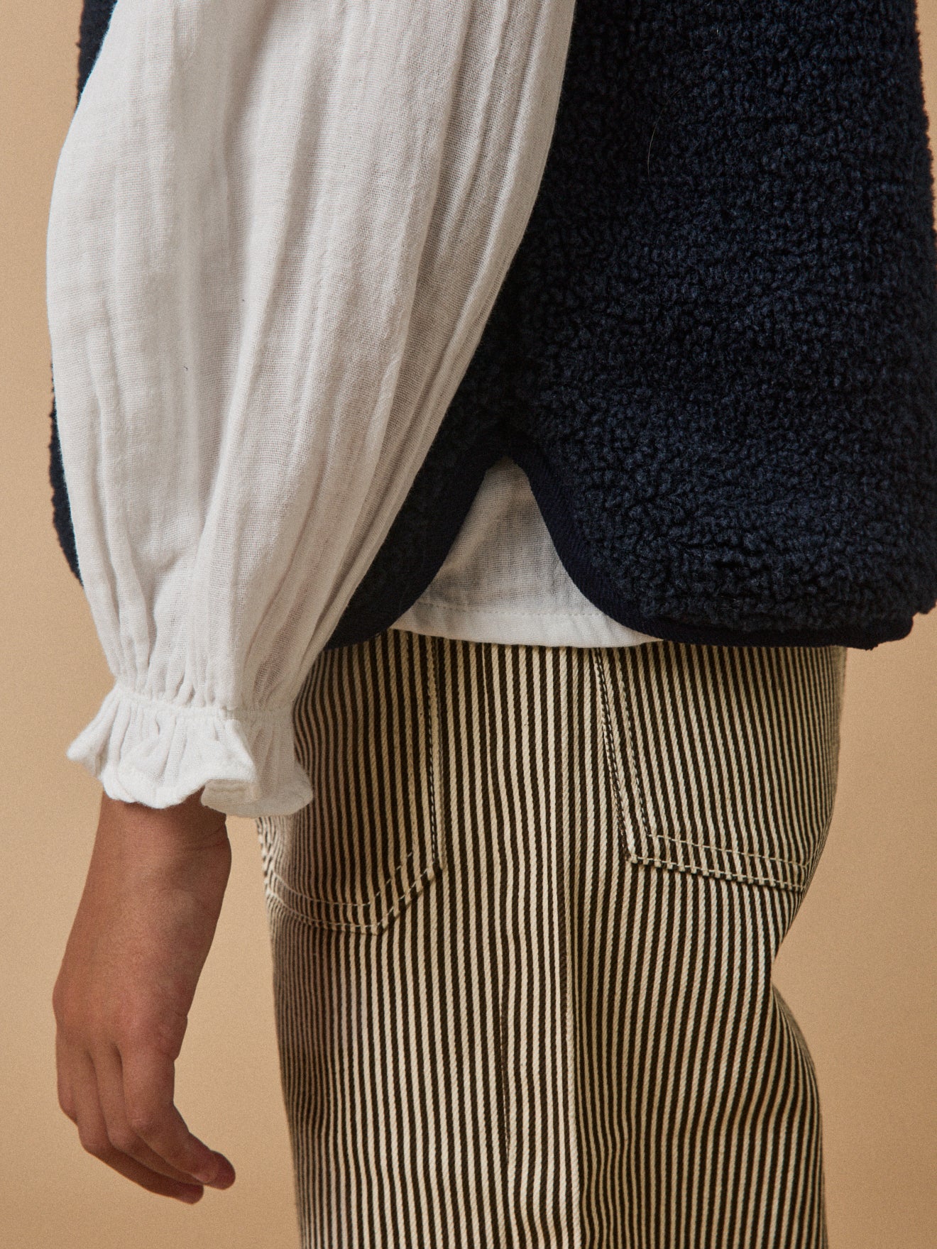 Style, douceur et finitions soignées. La veste moutonnée sans manches à fière allure de l’automne au printemps : en veste d’extérieur en entrée de saison, en cardigan au coeur de l’hiver.