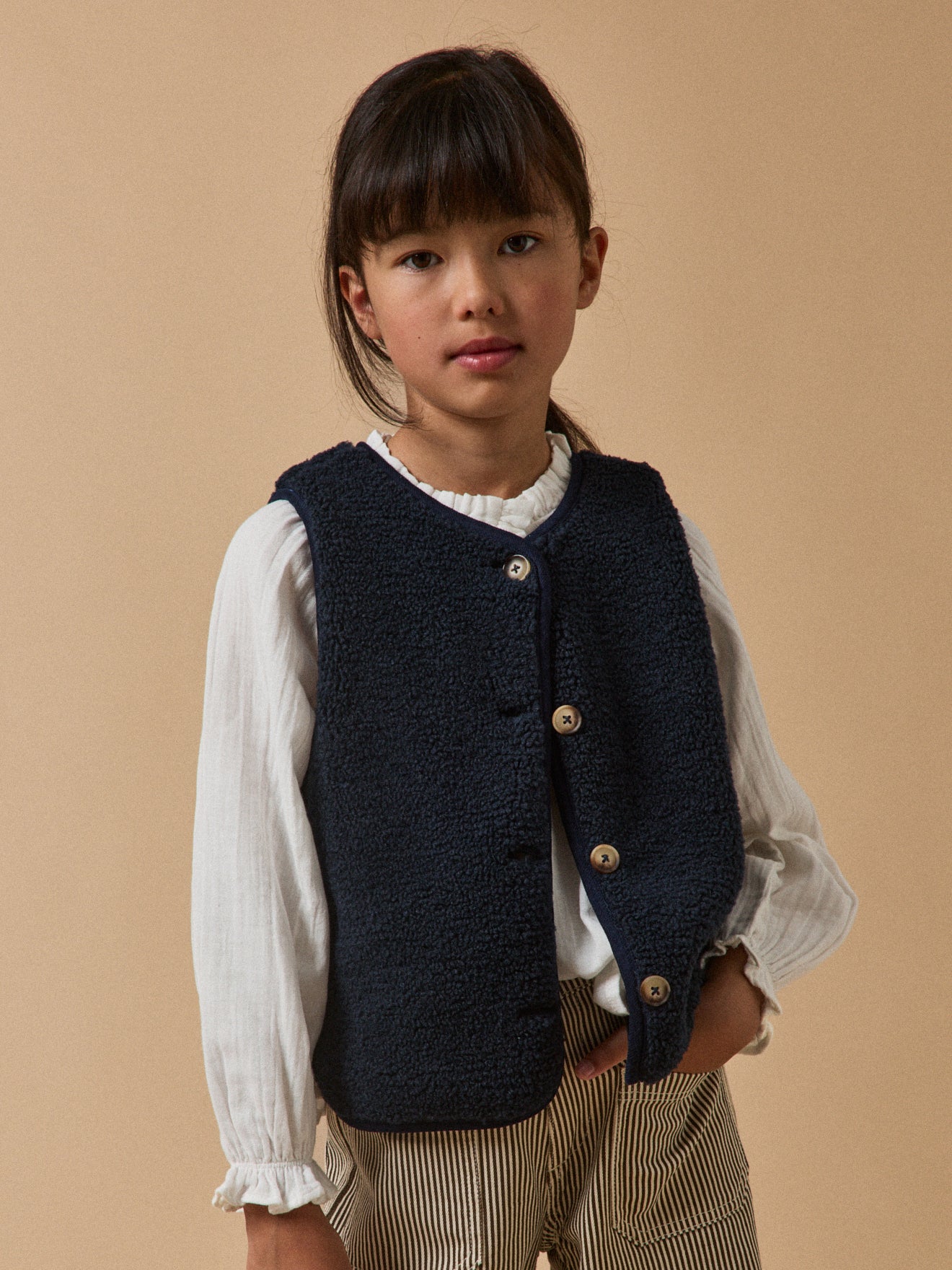 Style, douceur et finitions soignées. La veste moutonnée sans manches à fière allure de l’automne au printemps : en veste d’extérieur en entrée de saison, en cardigan au coeur de l’hiver. Biais en velours contrasté Fermeture par boutons. Petites fentes côtés
