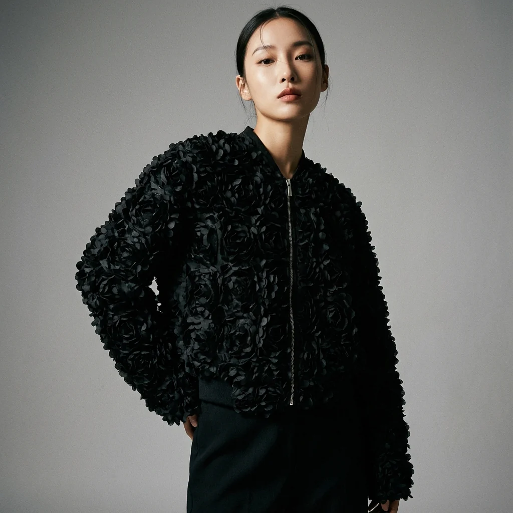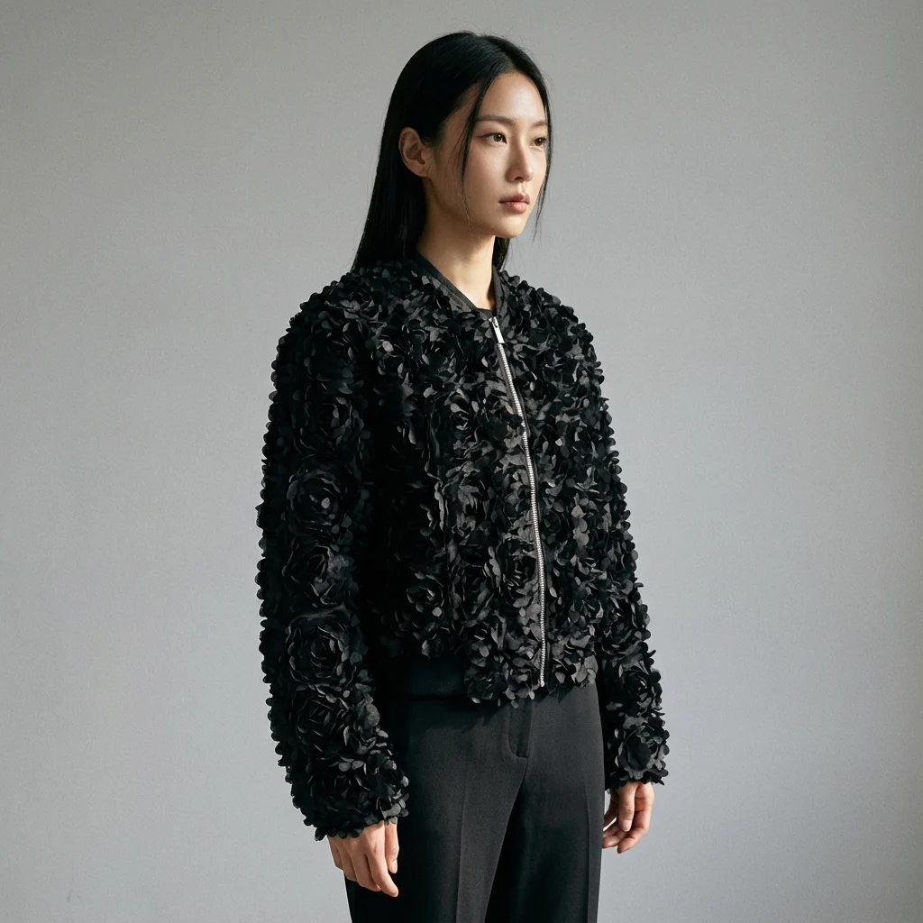 Découvrez notre Veste Florale Noire Coréenne, une pièce incontournable pour un look urbain et élégant. Son tissu texturé aux motifs floraux délicats apporte une touche de sophistication à ce blouson léger et confortable, parfait pour toutes les occasions. ✨