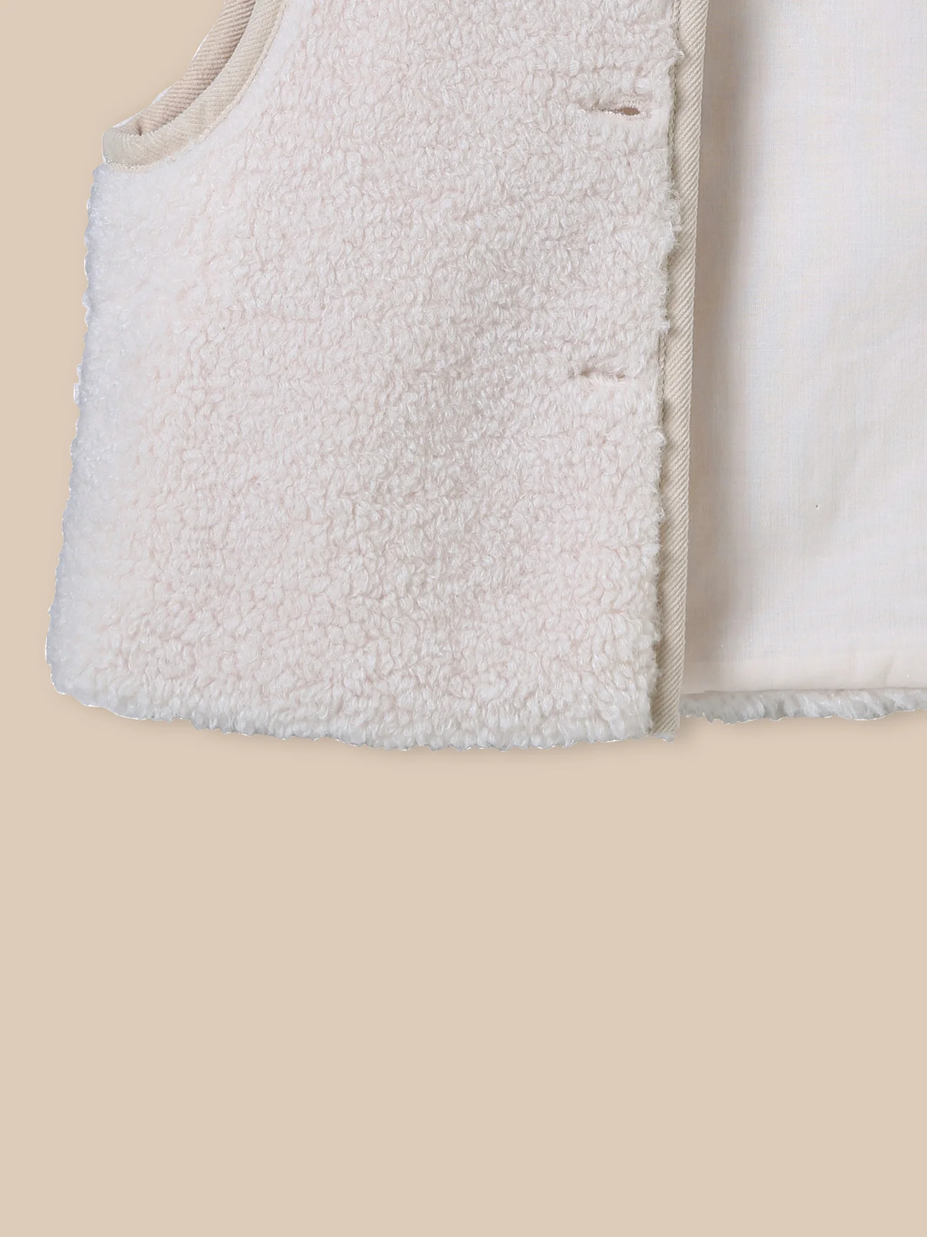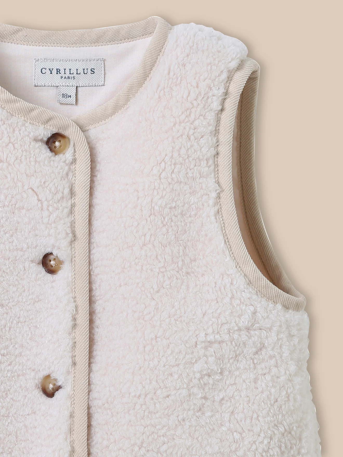 Cette veste en sherpa est parfaite pour réchauffer une guimpe et donner un petit look cosy à la silhouette. Biais en velours contrastés Doublure en voile Fermeture par boutons
