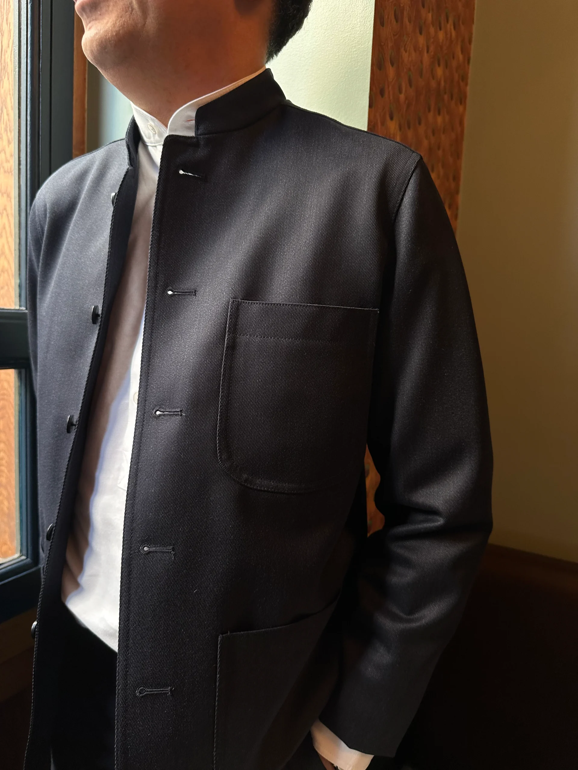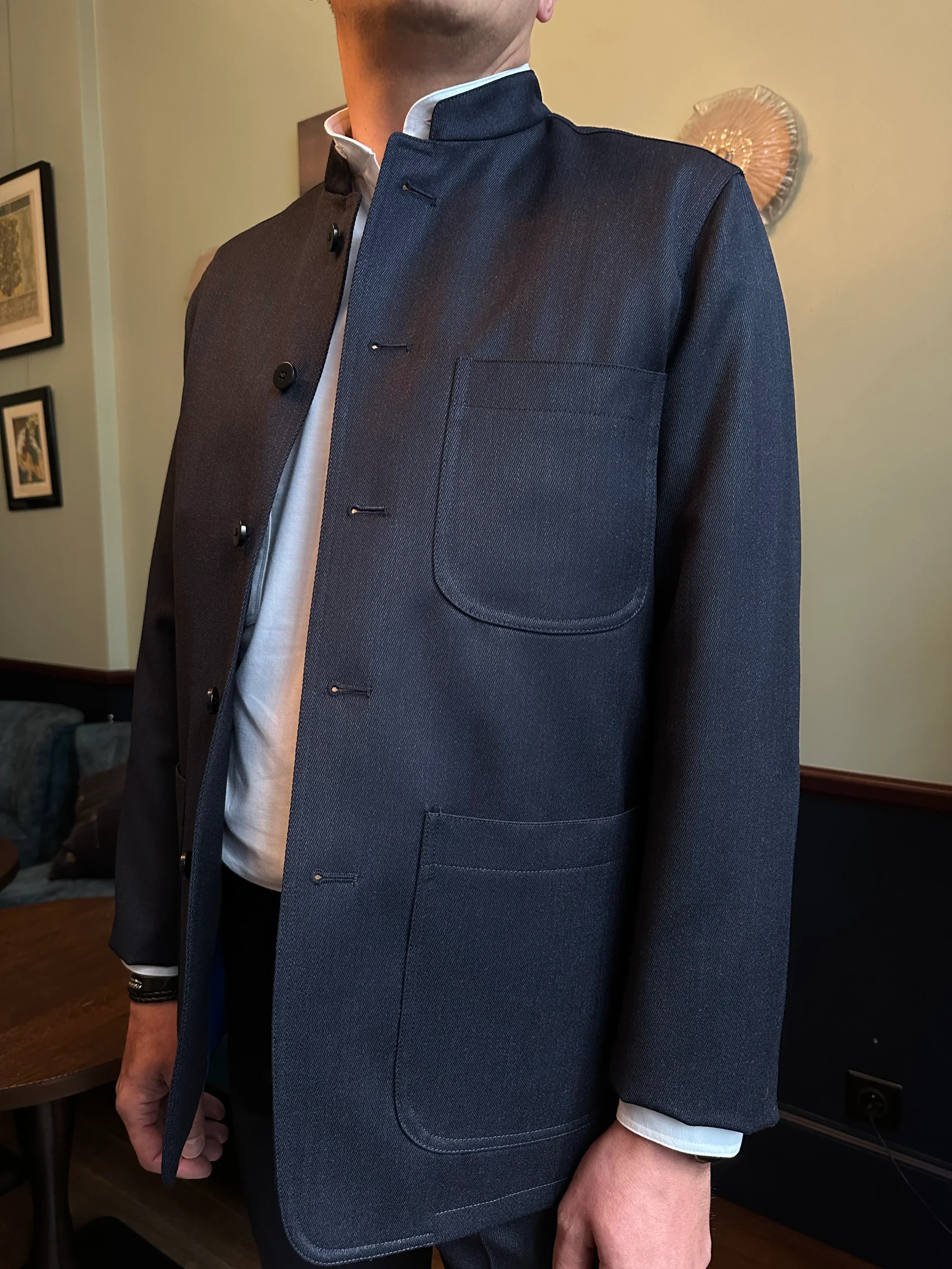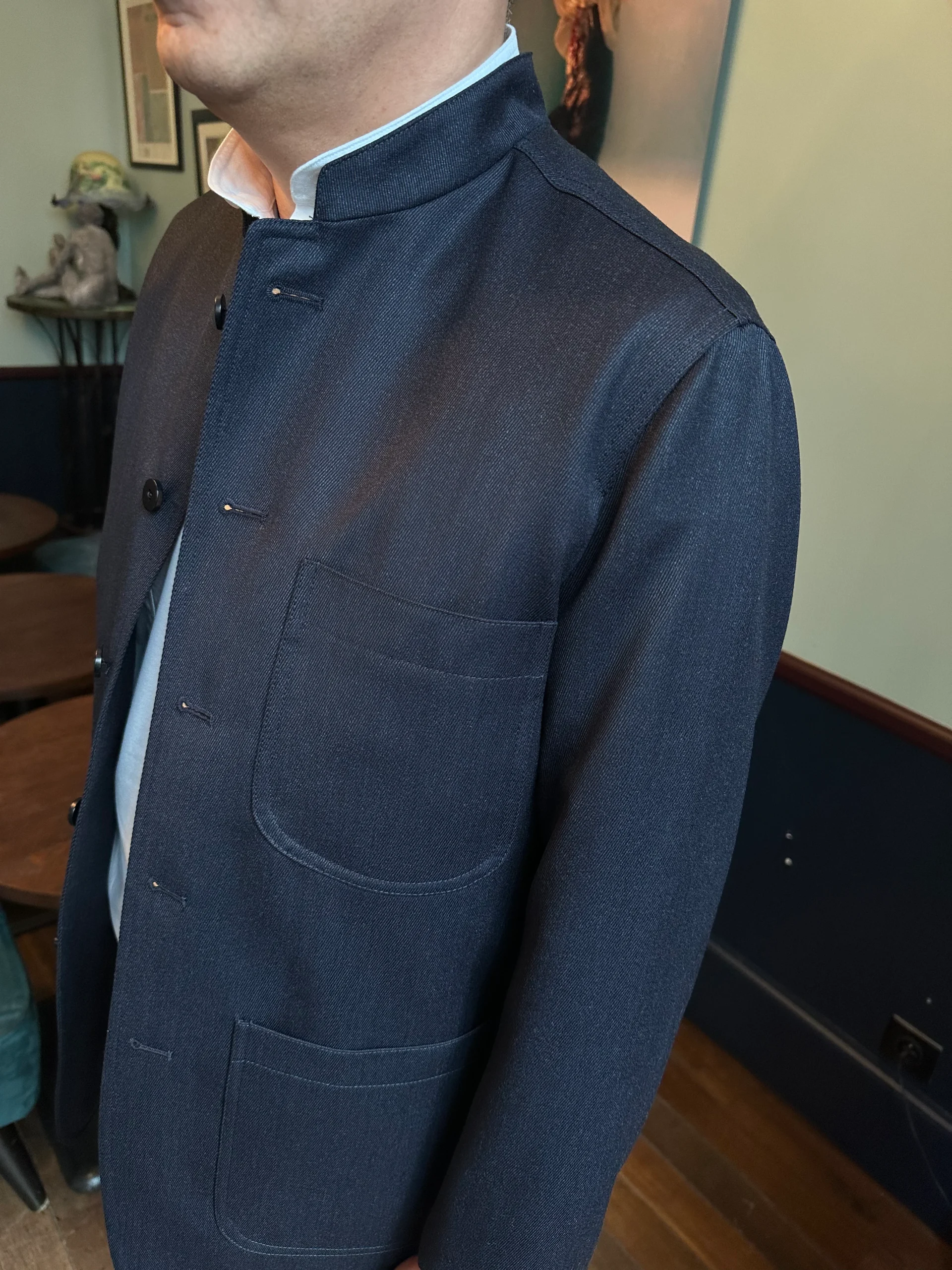 veste architecte à col nehru en denim extensible sanforisé indigo