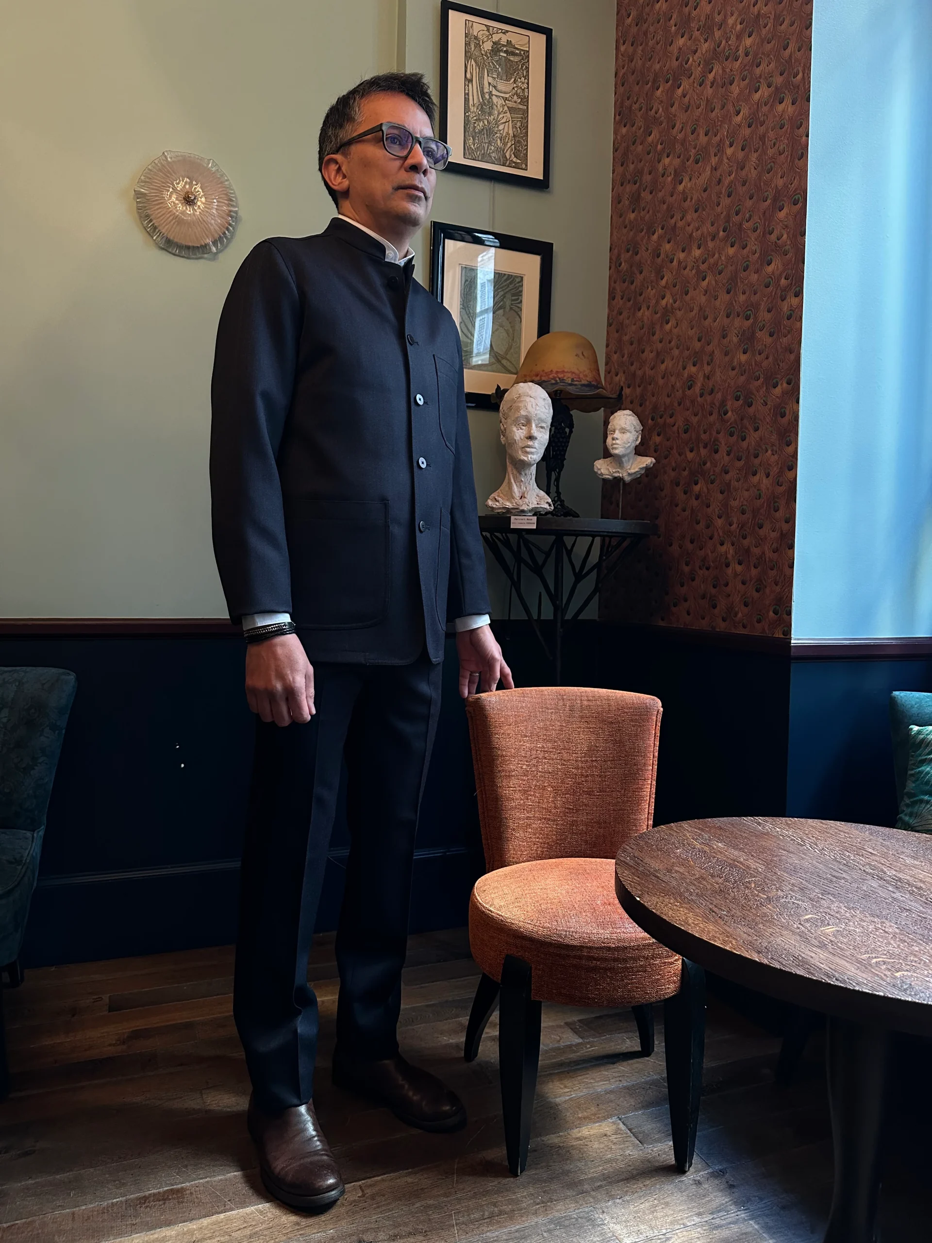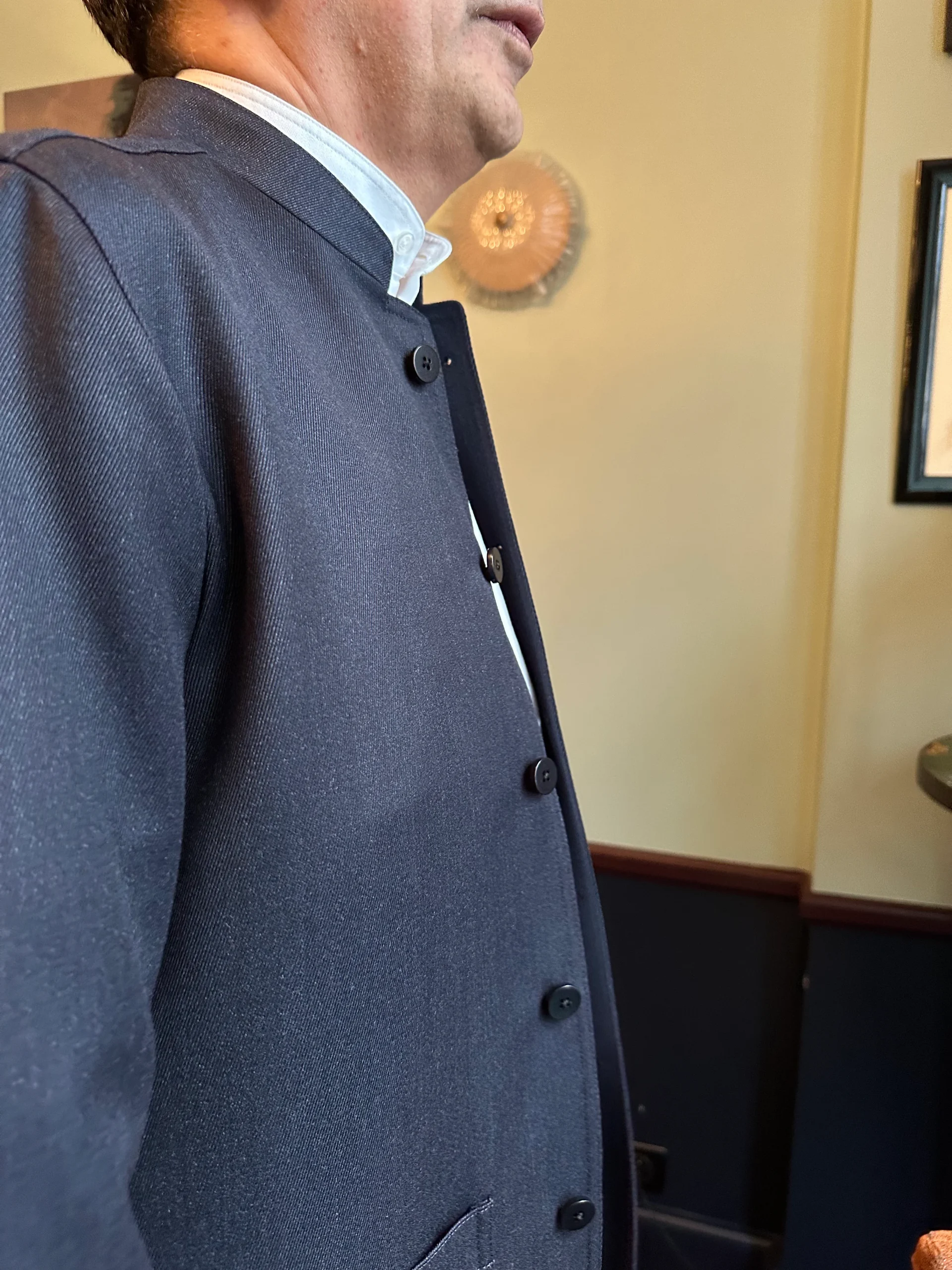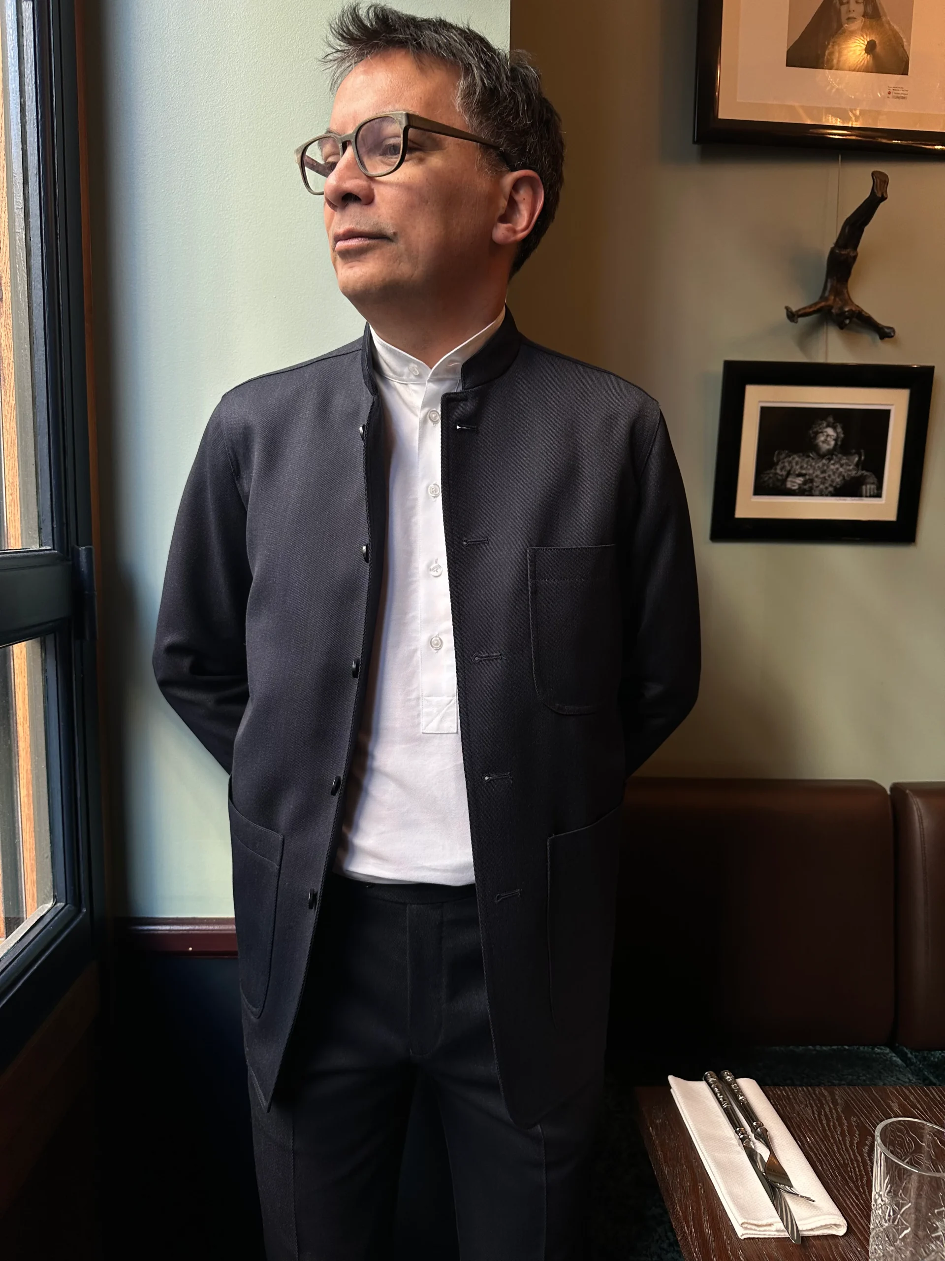 veste architecte à col nehru en denim extensible sanforisé indigo