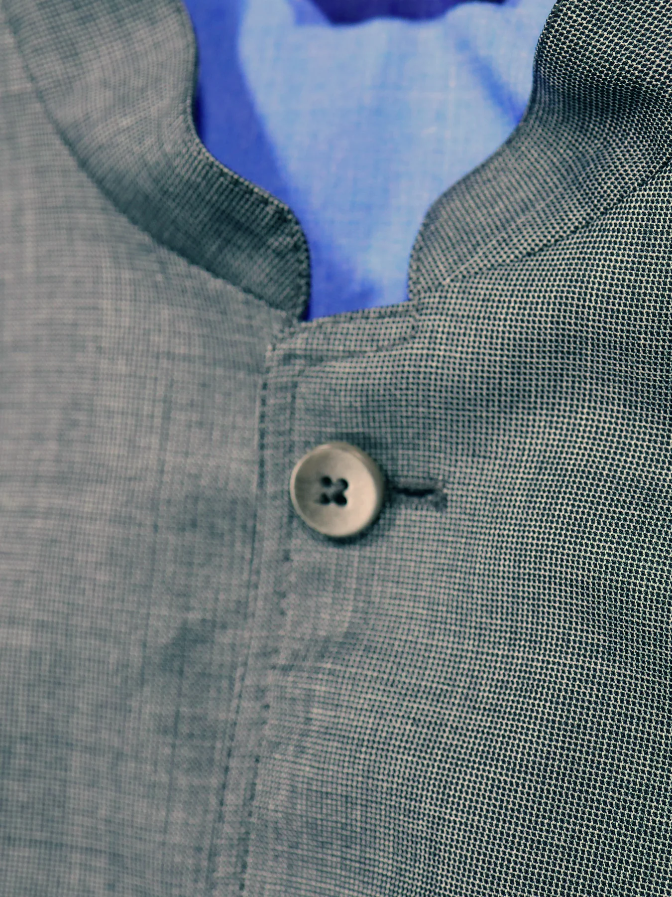 veste architecte à col nehru en denim extensible sanforisé indigo