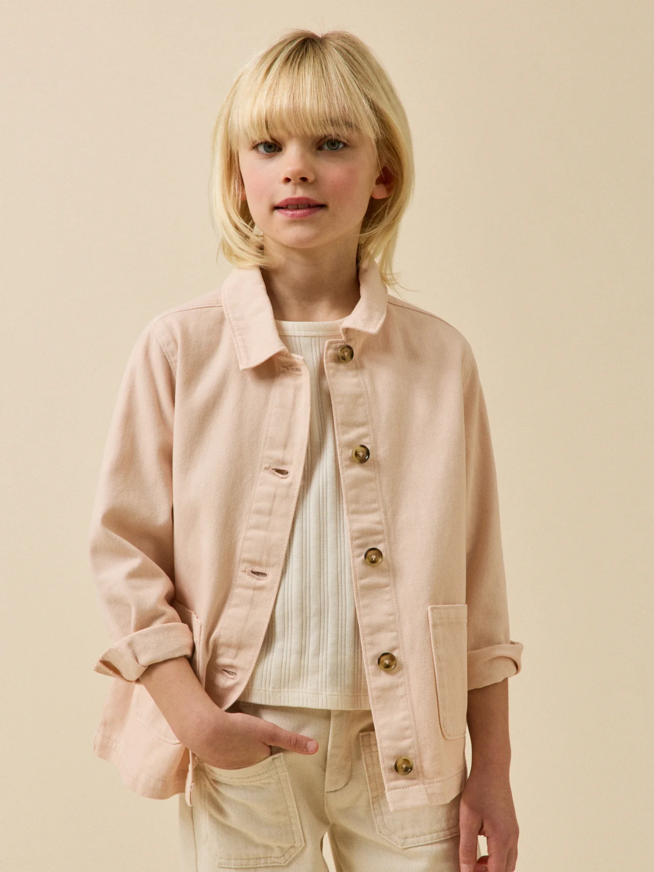 La veste worker, en toile denim couleur pastel, est un incontournable du dressing d’été. Boutons effet corne devant et aux bas de manches 2 poches plaquées