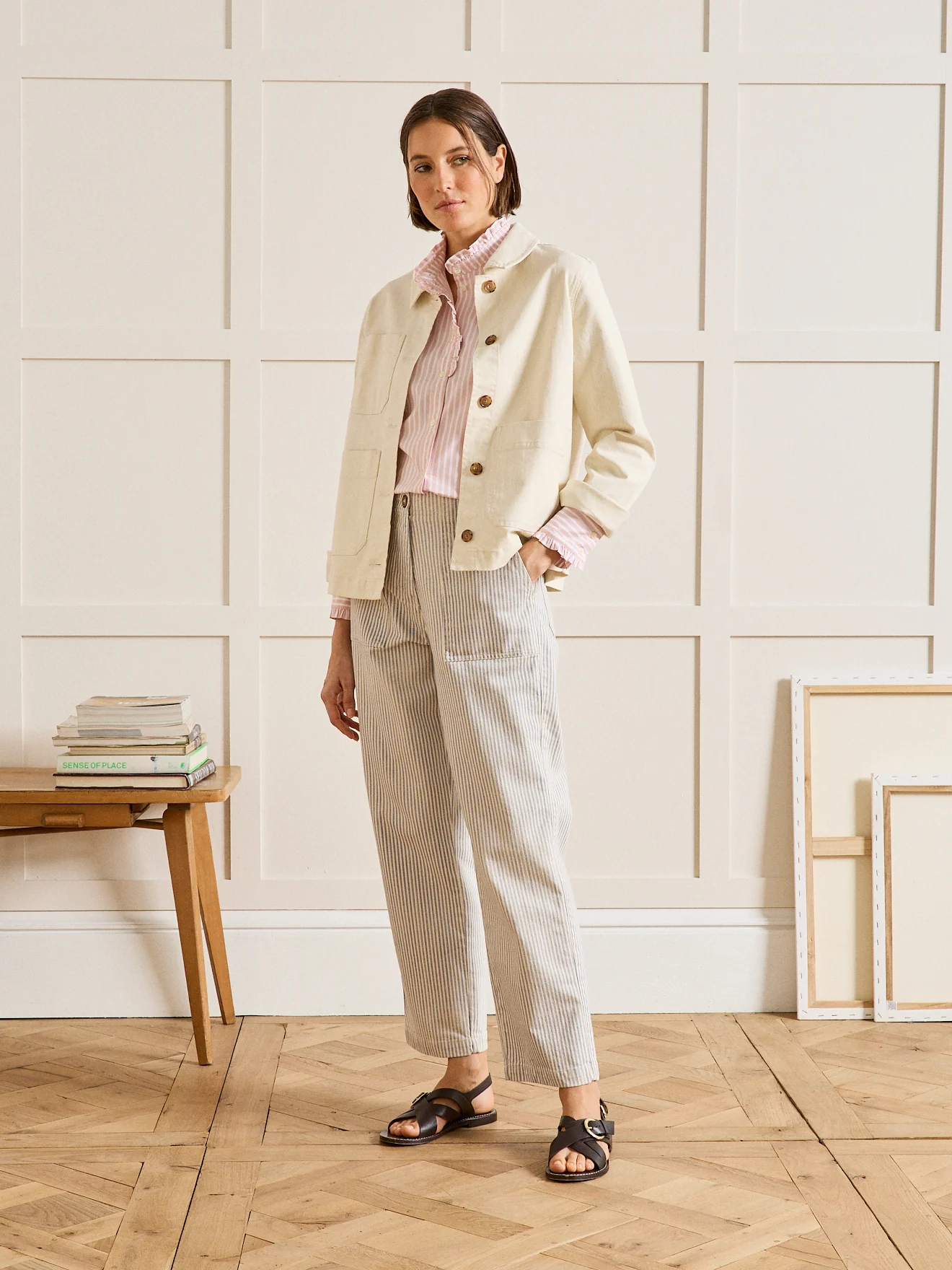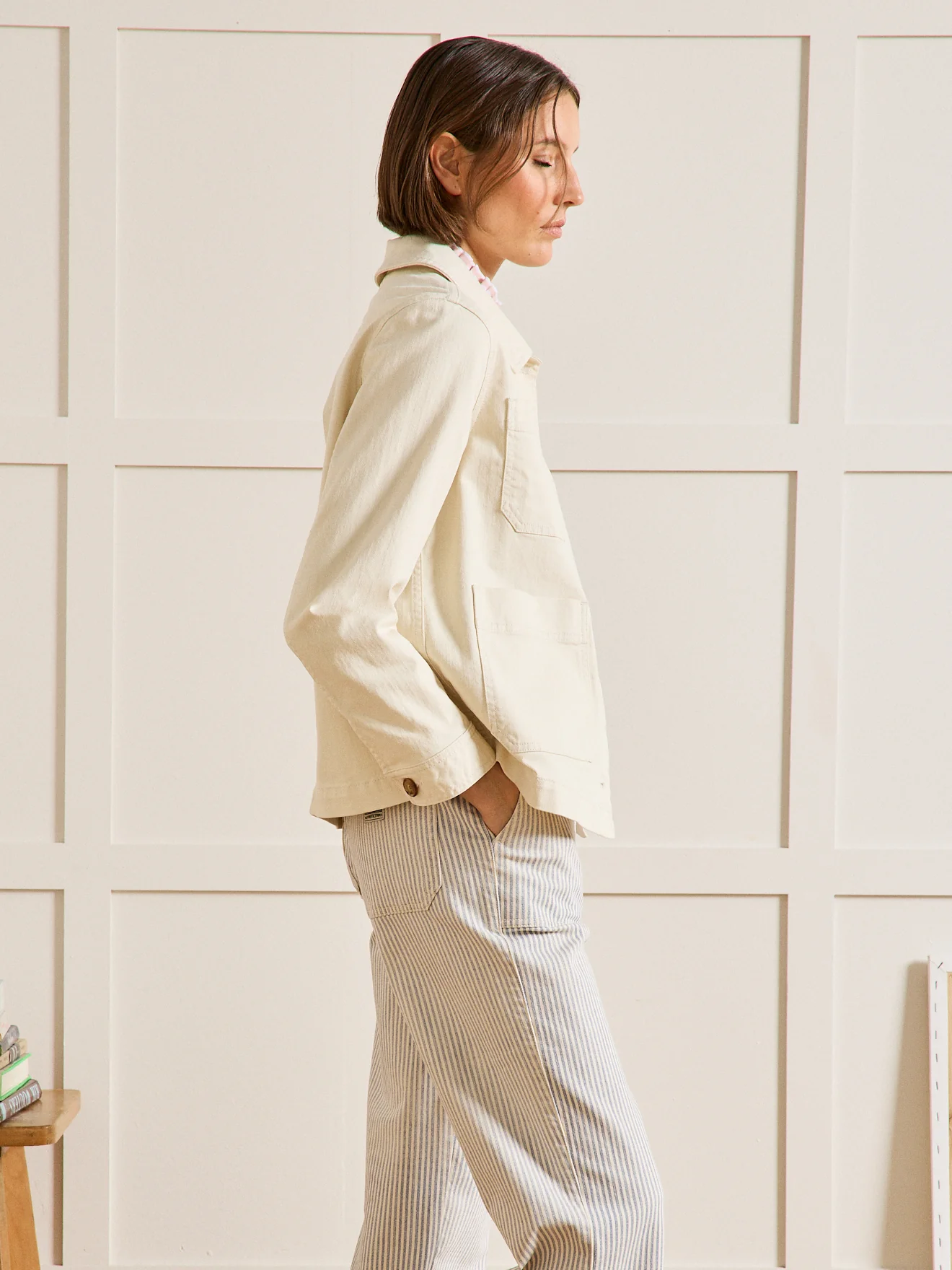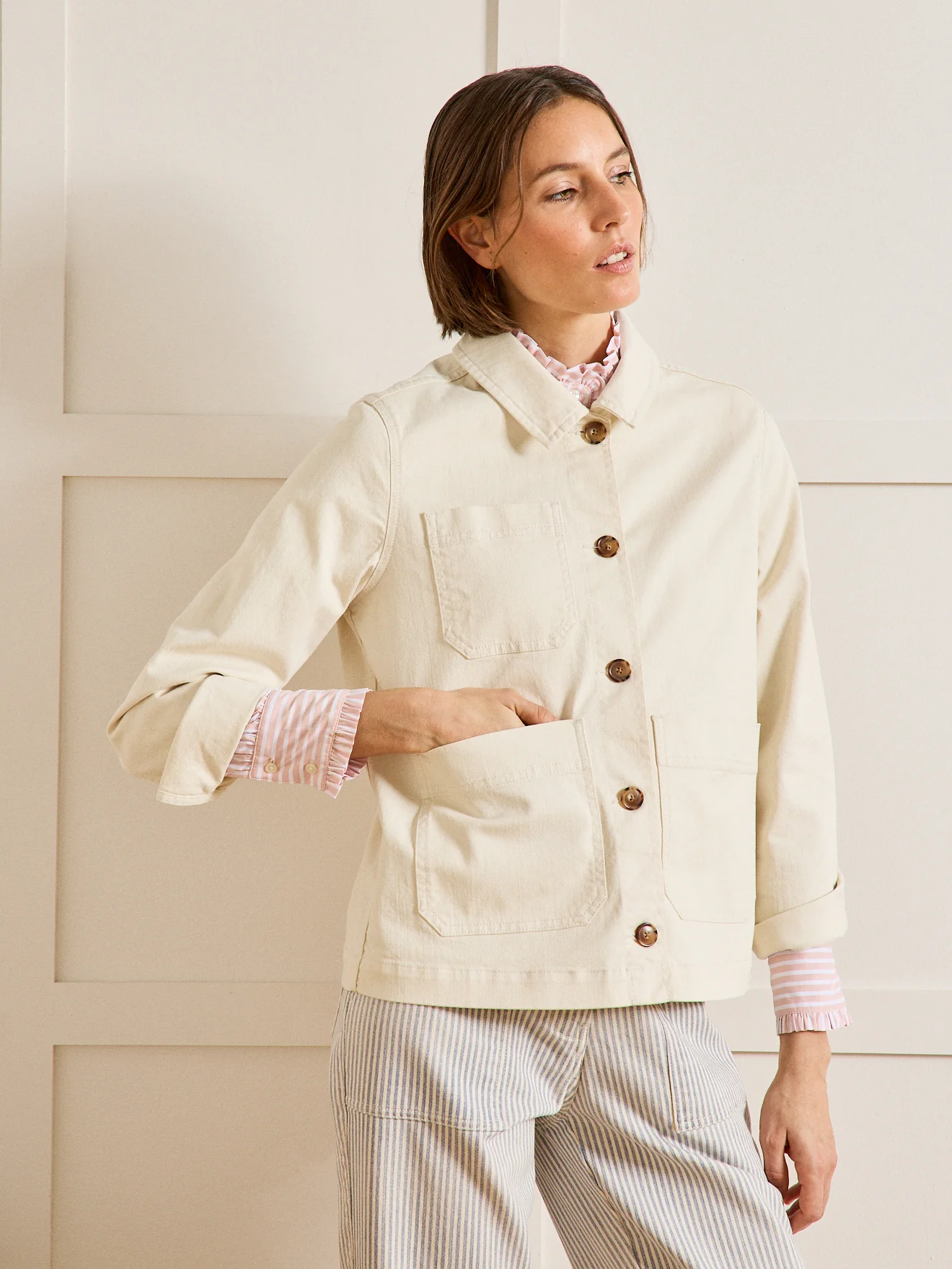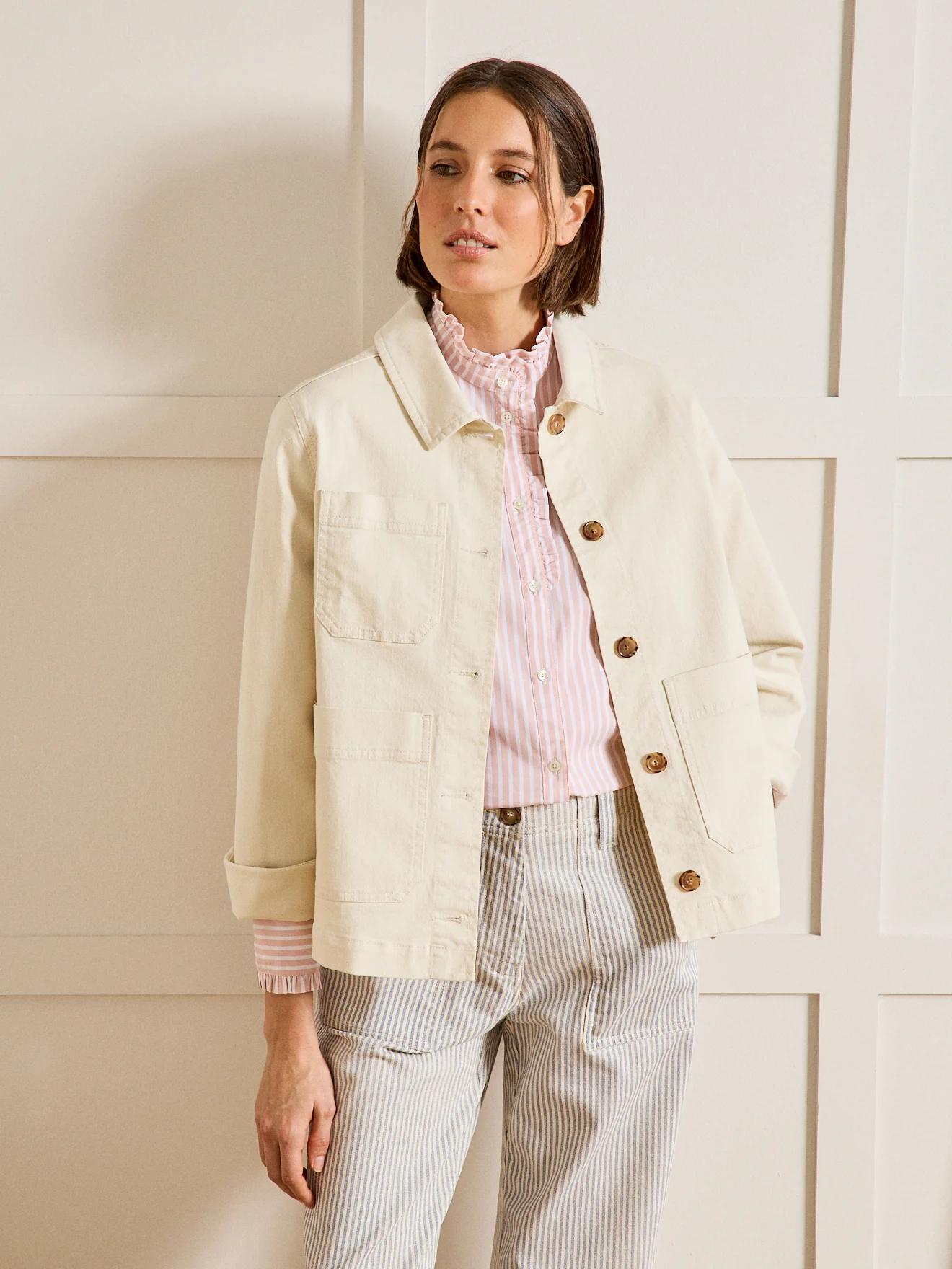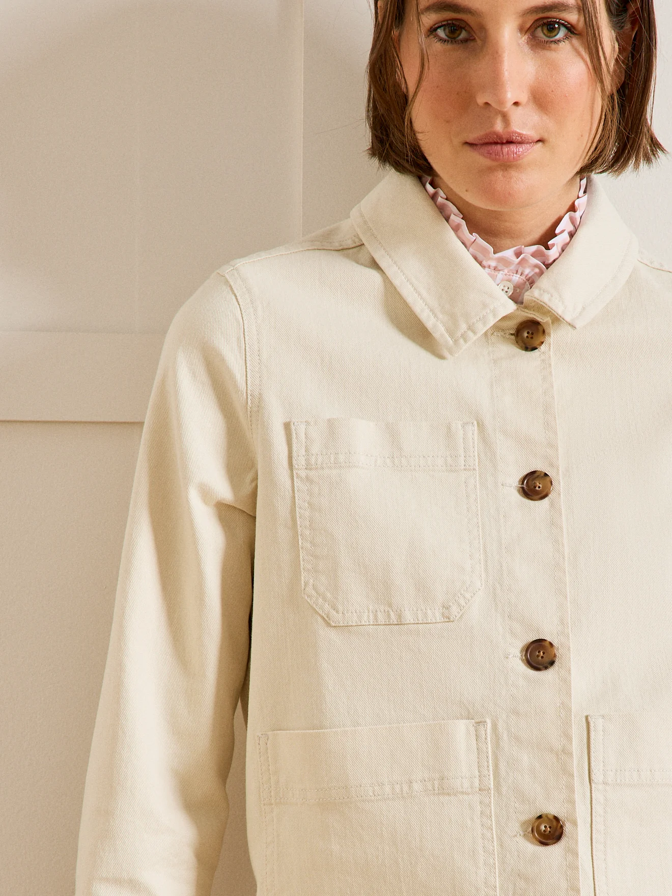 - Veste worker coupe droite ; petit col pointu, fermeture boutonnée et 3 poches plaquées devant